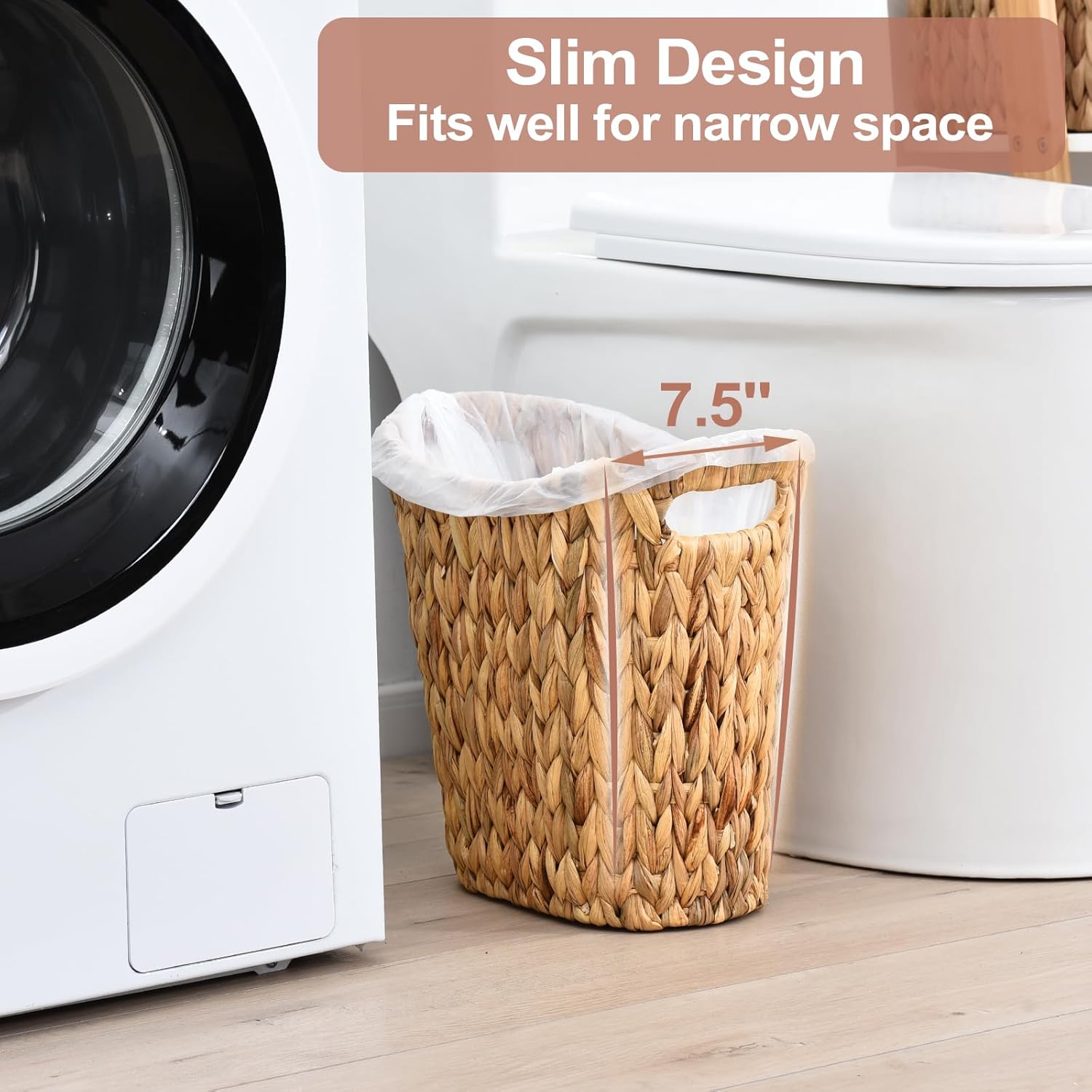 - Plant Material: Water hyacinth is imported from Vietnam and rich in plant fibers, with thick & soft touch. It is naturally sun-dried without any coating, and then braided and woven into a durable wicker bathroom trash can, which is environmental and safe.