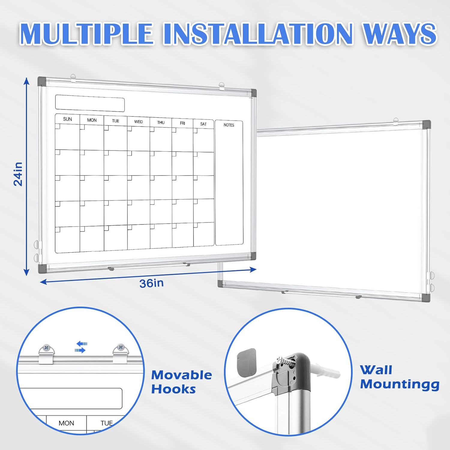 Monthly Calendar Dry Erase Whiteboard for Wall, 36" x 24" Double-Sided Calendar White Board, Magnetic Portable Board for Office, Kitchen, School, Home