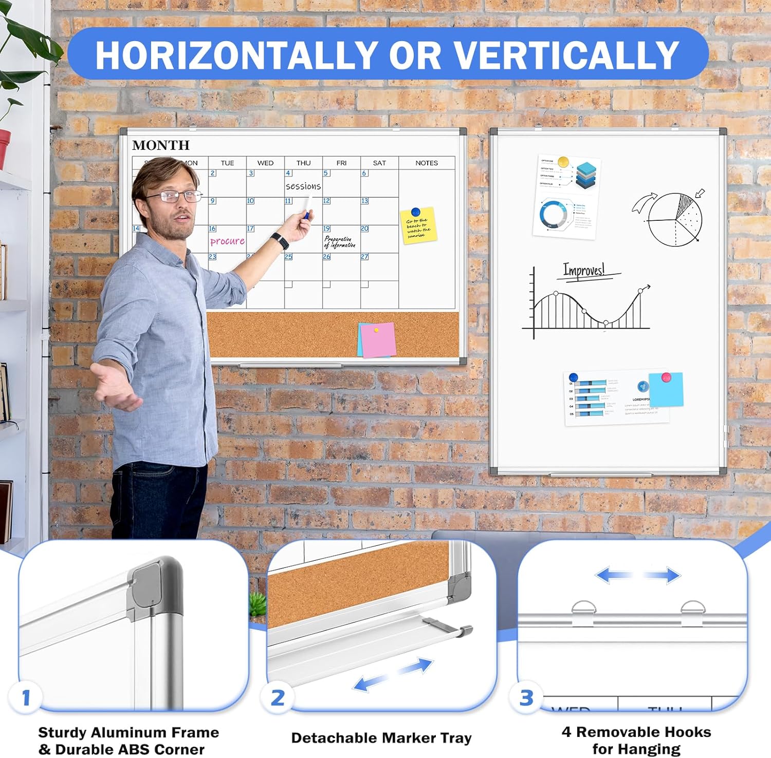 - 【3 in 1 Combo Calendar White/Cork Board】: Our monthly whiteboard can put your life in order and plan ahead. Magnetic dry erase calendar combo board includes cork strip across the bottom. Perfect for pinning notes, messages, pictures, memos, calendars, menus, reminders and more. The magnetic double-sided whiteboard allows you to have two projects going. The other sided is blank. It is the best tool for home teaching or memo.