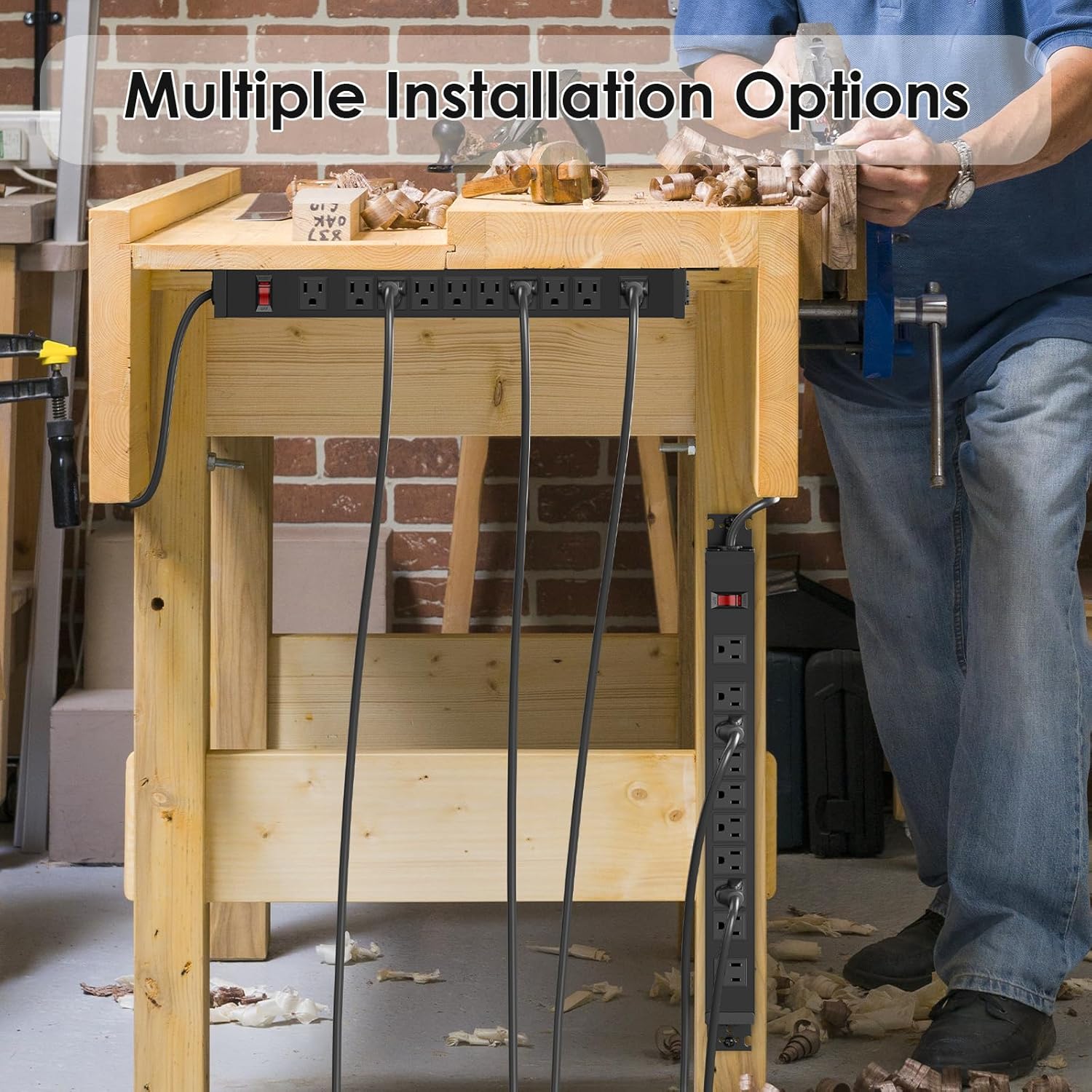 JUNNUJ Multi Angle Mount 10 Outlet Power Strip Heavy Duty, 2700J Surge Protector Under Desk with Switch 15A, Garage Workbench Power Strip Gaming Outlet Table Wall Mountable, 10FT 14AWG Extension Cord