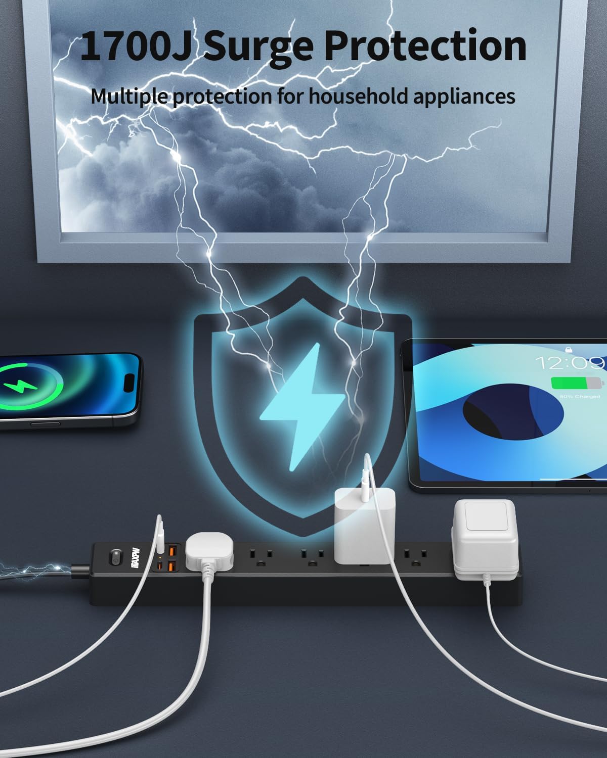 - 【Safeguard Your Devices】-This long outlet power strip has a 1700-Joule energy rating providing a reliable surge protector to protect any meeting room, office, personal workstation, or entertainment center.
