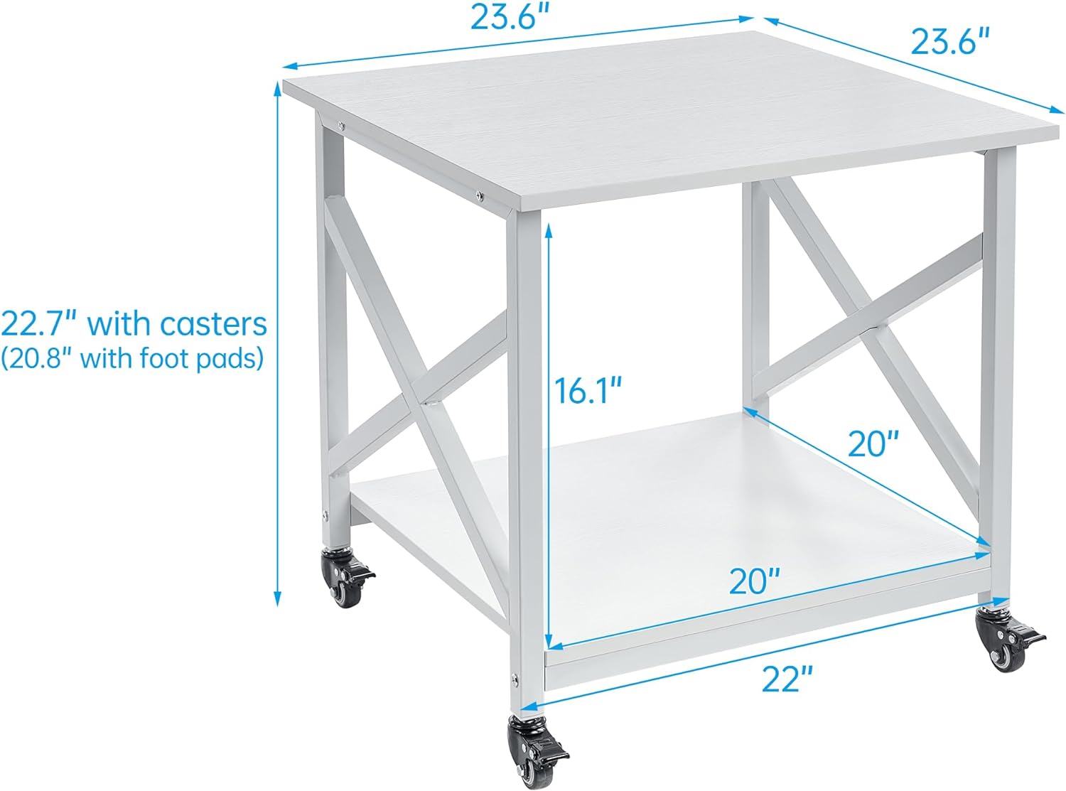 - 【Large Storage Space】With a spacious 23.6" square table top and a weight capacity of 150lb on the top tier, this stand is designed specially for large and heavy printer, scanner and other bulky machinery. The 20" square lower shelf, boasting a clearance height of 16.1" and a weight capacity of 100lb, provides ample space for storing additional equipment or arranging office supplies. Stay organized and efficient with this versatile printer stand.