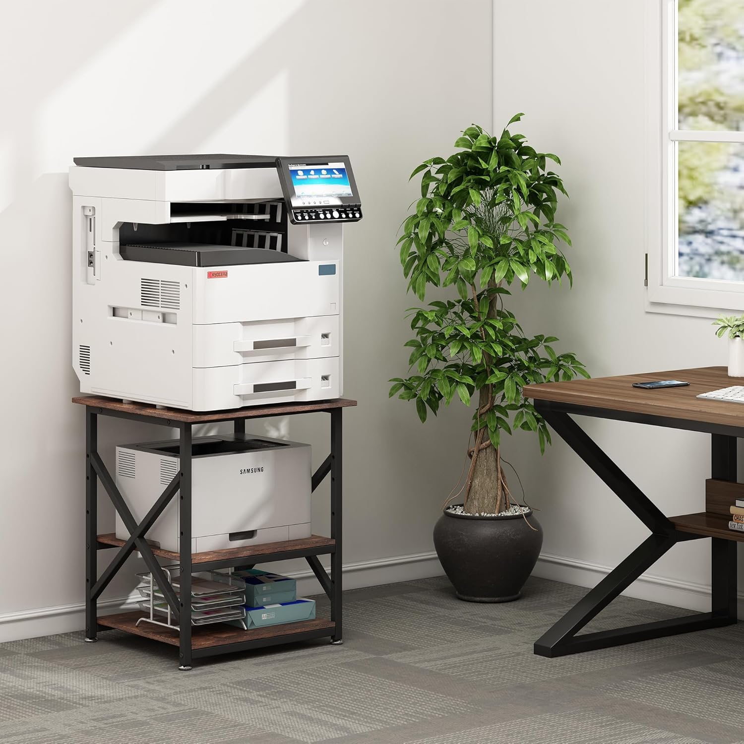 - 【Sturdy and Heavy Duty】Unlike some other designs in the market where shelves are merely screwed into the side frame, each shelf of this printer stand is bolstered by a sturdy steel tube underneath, ensuring a robust structure and impressive weight-bearing capability. Crafted with premium particle board featuring a water- and wear-resistant surface, and a reinforced 0.98 inch square steel tube frame—thicker than the standard 0.78 inch frame—this printer table stands as a reliable piece of furniture built to last for years.