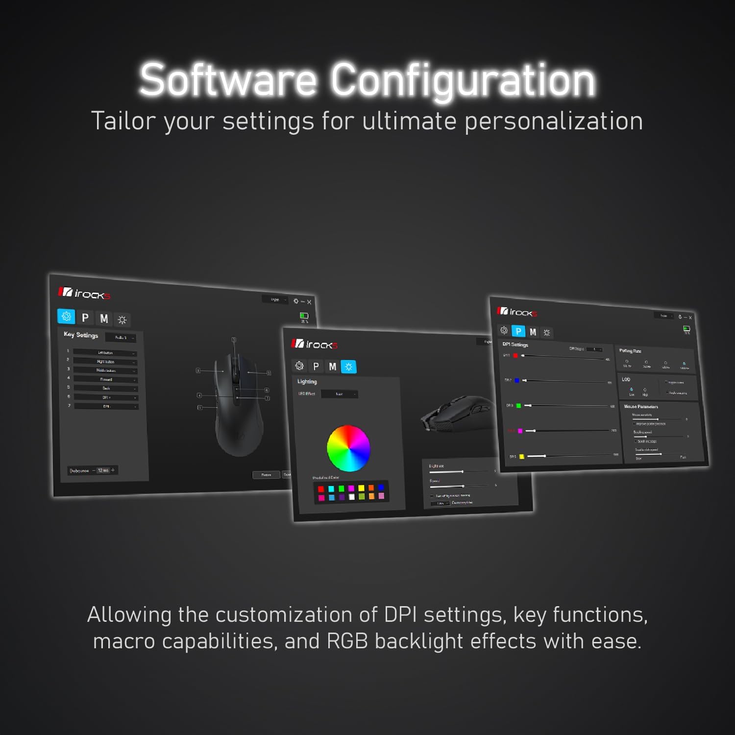 iRocks M31R Wireless Gaming Mouse, Triple Mode 2.4G/ Bluetooth/USB-C Detachable Cable Gaming Mouse, Kailh GM8.0 Mouse Switches, Advanced PixArt PAW3395 Optical Sensor, Up to 26,000 DPI - Black