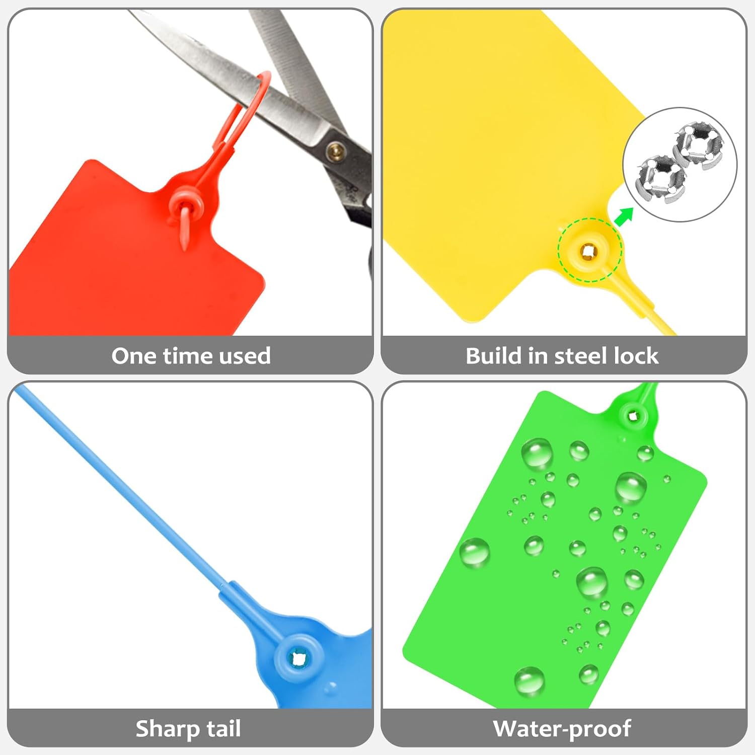 - Easy to use: The big label ties tags is single used and self-locking design. Each tamper proof security seal tags is equipped with metal locking mechanism inside. Just simply insert the tail and pull tight to lock. No tools needed and cannot be pulled out once locked.