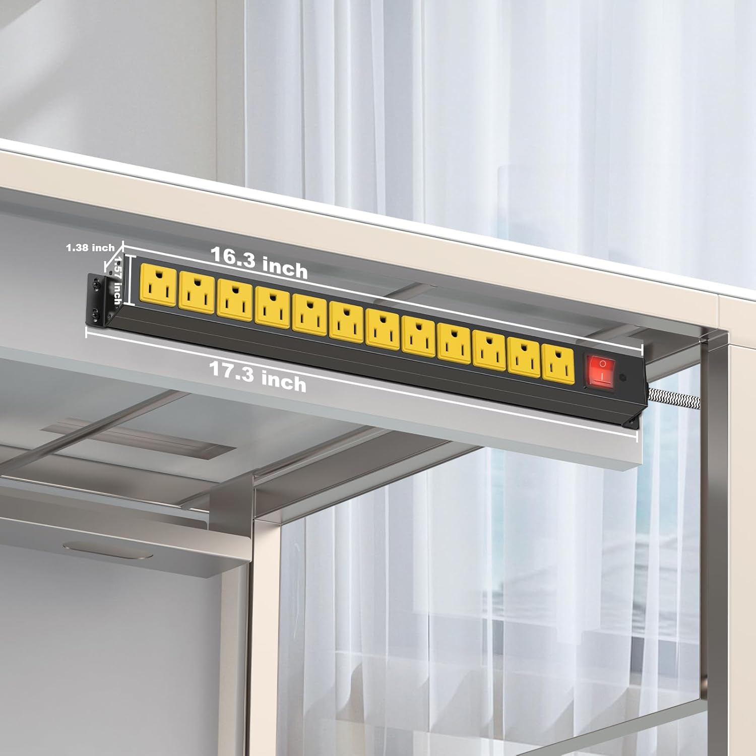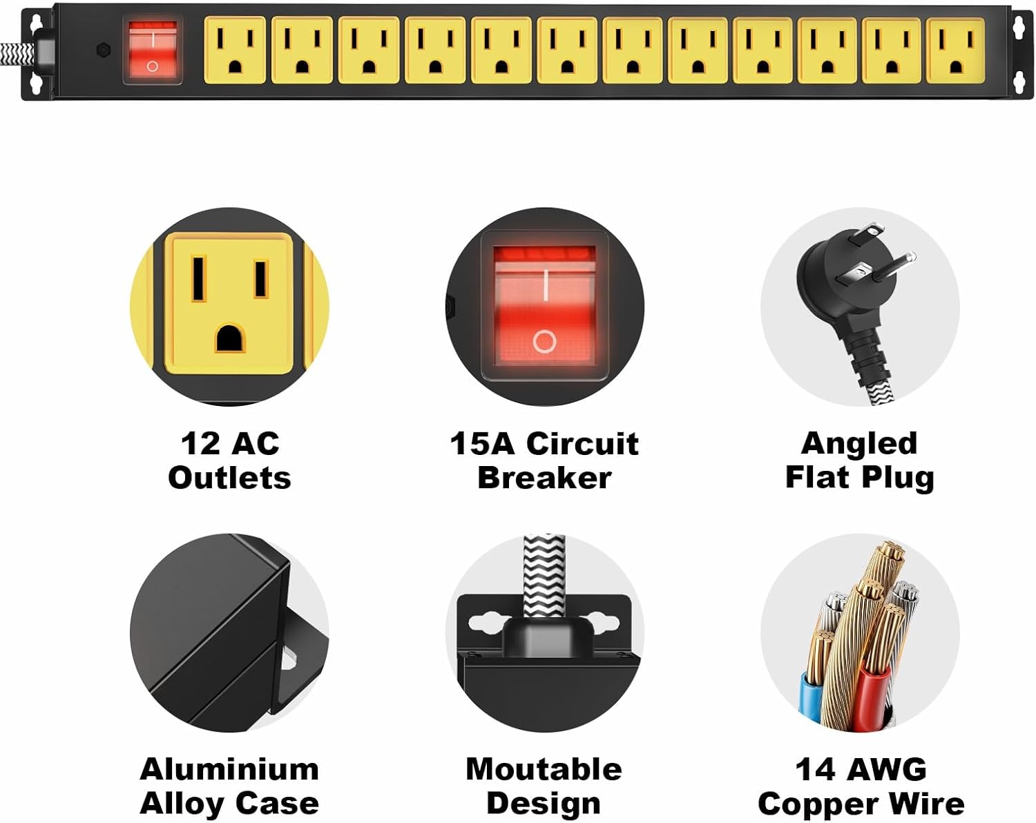 12 Outlet Heavy Duty Power Strip with 15A Circuit Breaker,Metal Wall Mount Power Strip for Garage Workshop Industrial 1200J 15A 125V 1875W 6ft Cord