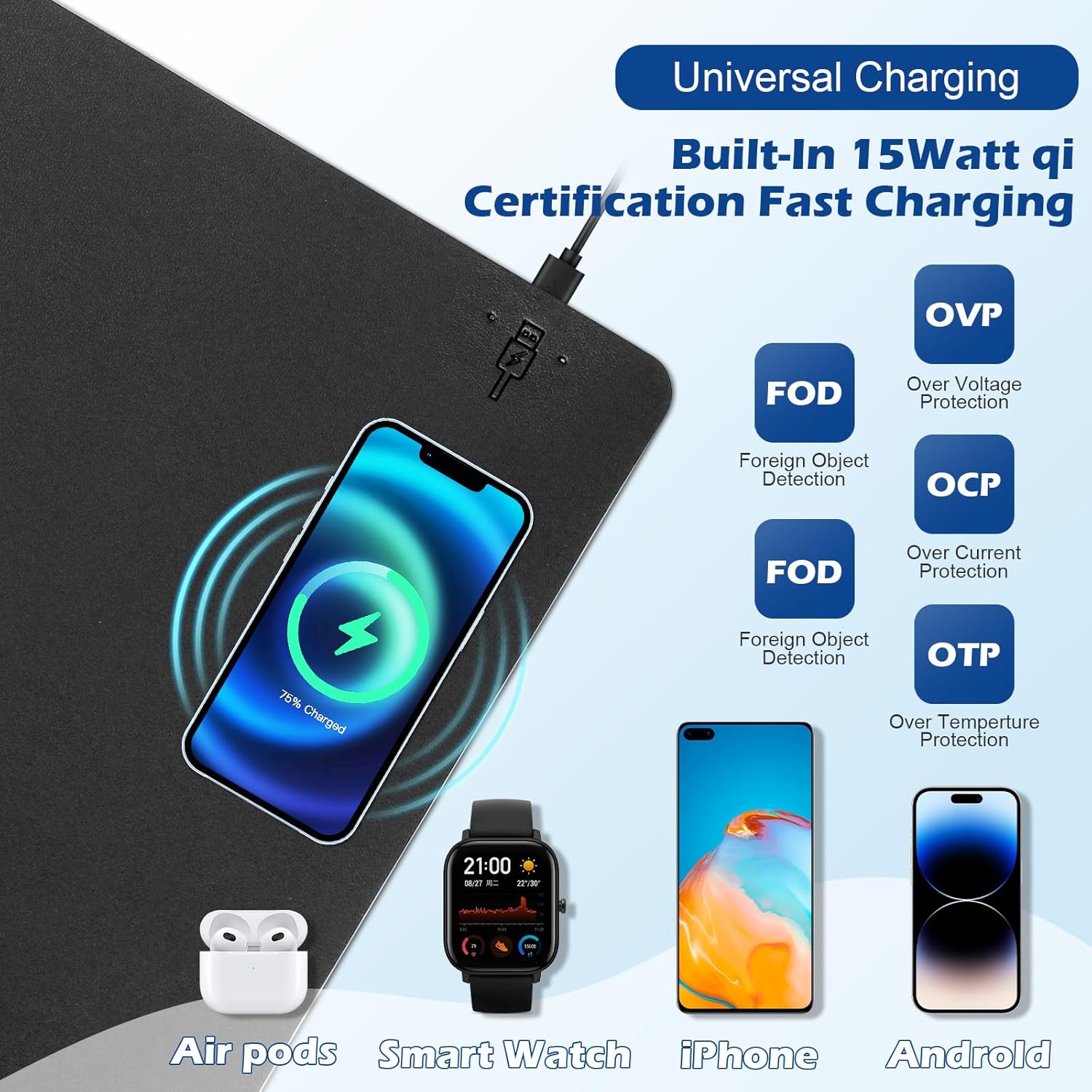 - Our Desk Mat with Wireless Charging Desk Pad features a built-in 15W wireless charger with QI technology, allowing you to conveniently charge your phone. Simply place your phone on the mat and it will start charging, eliminating the hassle of searching for charging cables. This feature ensures that your phone is always within reach and helps alleviate battery anxiety.(Note:Items that require charging should be placed in the center of the shock sign.Phone cases made of iron material cannot be directly charged.)