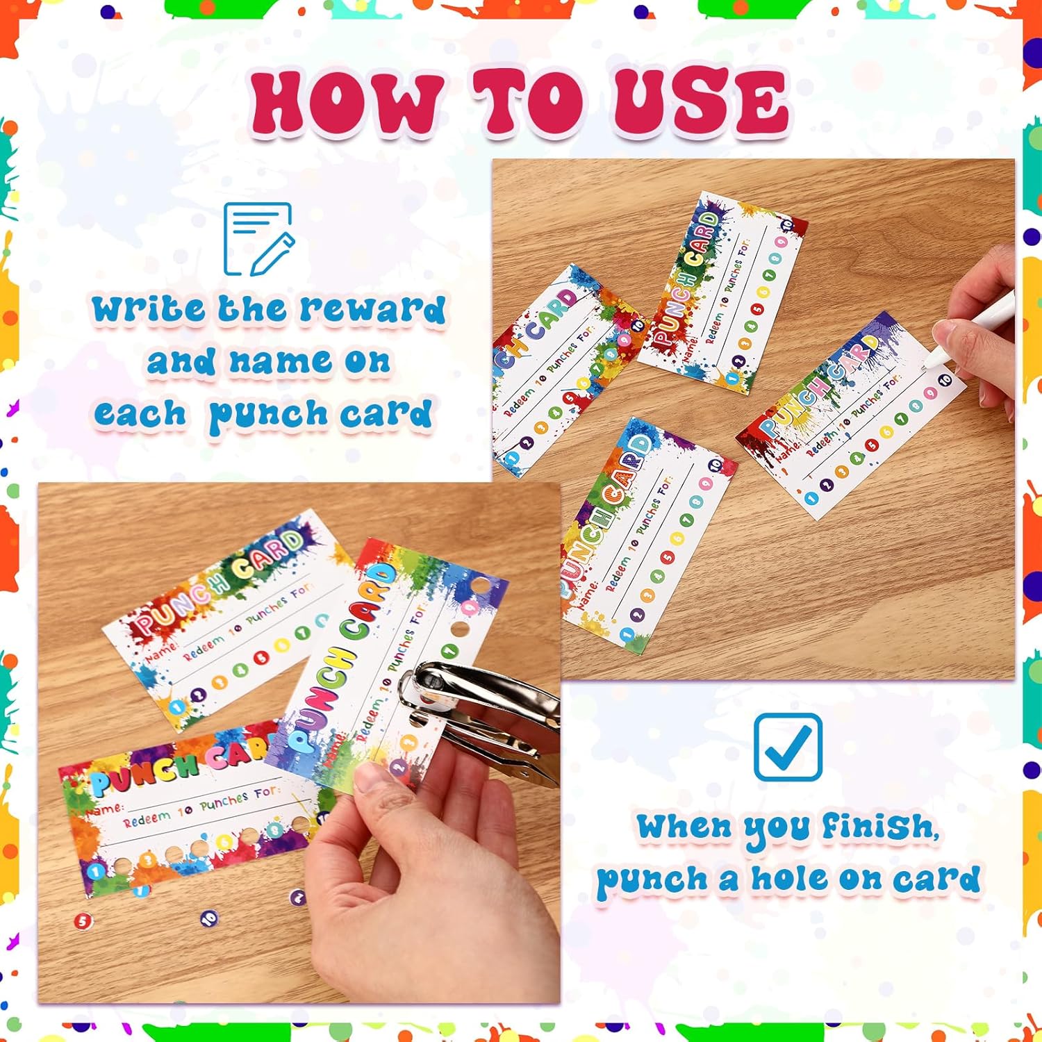 - Classic Design: incentive Kids behavior card at home has 8 different classic styles in patterns and colors, printed with letters like 'punch cards', 'redeem 10 punches for', etc., simple and generous; Vivid and eye-catching, blank back design allows you to send other messages to students; Punch design 1 to 10 score, you can punch in according score