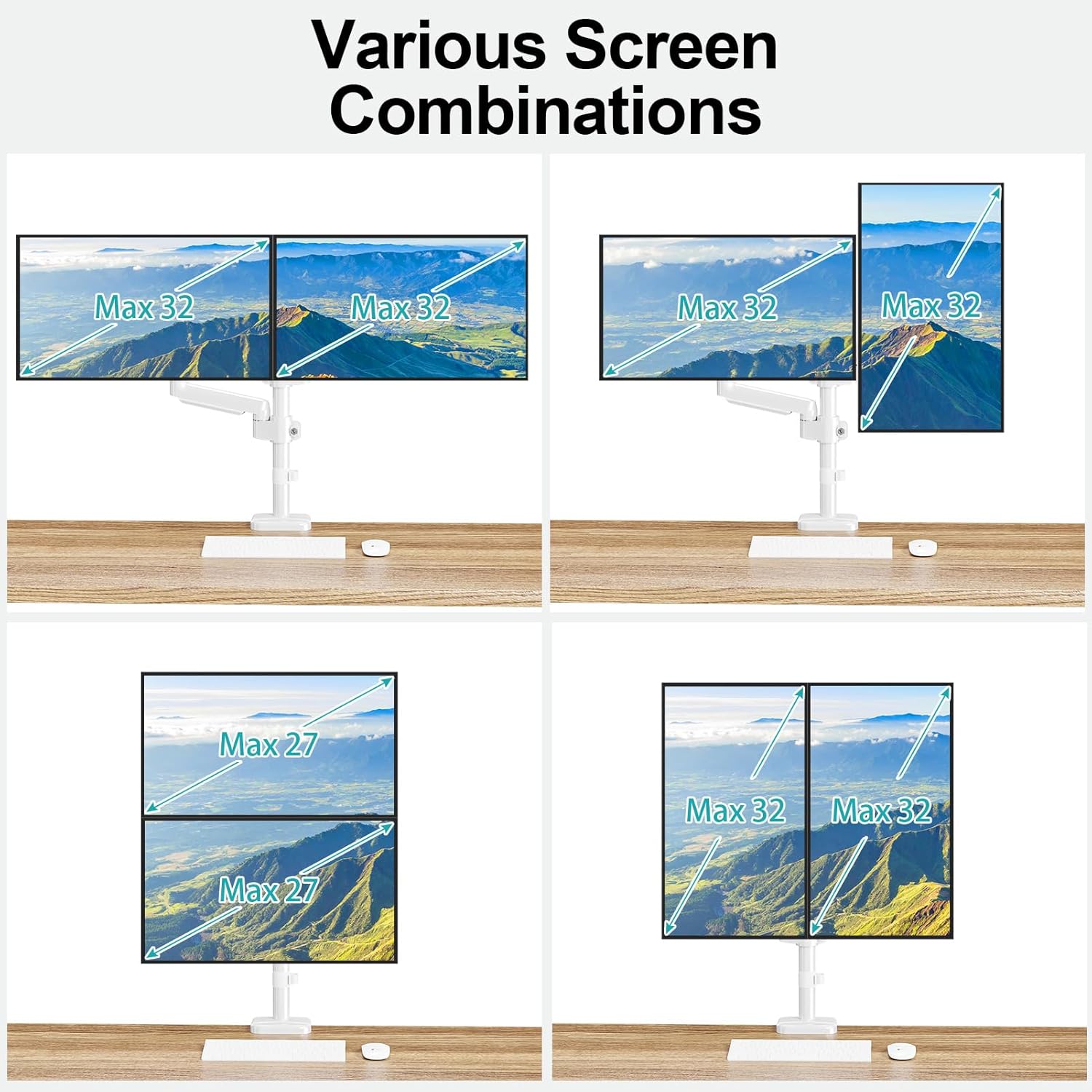 - Compatible with Most Monitors-This dual monitor stand is designed to fit most 13″–32″ flat or curved monitors with VESA mounting patterns 75x75 or 100x100mm, not limited to 32 30 28 27 25 24 23 22 21 20 19 17 inch screen, but not compatible with 1000R/1500R/1800R curved screens. Each arm holding 4.4-19.8 lbs. Please verify your monitor's size, weight, and VESA pattern before purchasing.