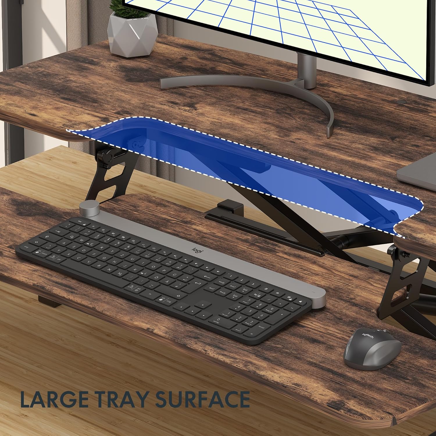 - Double Layer Office Space -This adjustable standing desk converter with a wide desktop is super space-saving and has enough space for all of your gadgets, it can hold a computer monitor, paperwork, and tablet, phone, notebook, coffee, and so much more! An oversized keyboard tray that accommodates flexible setup options like a 17-inch laptop or a keyboard and mouse.