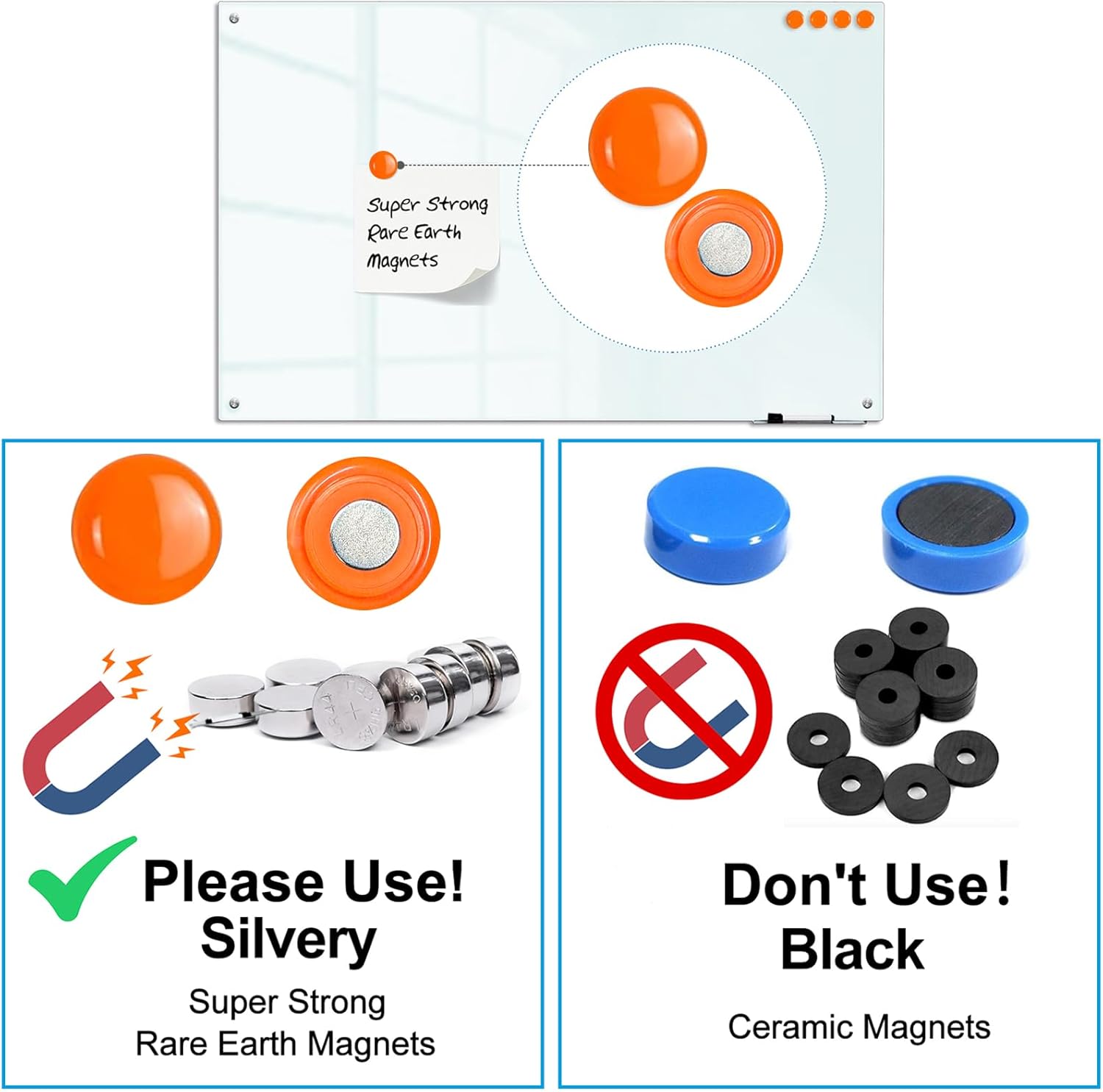 - COMPREHENSIVE ACCESSORIES SET: Comes with one 48" x 36" frameless tempered glass whiteboard, two markers, four magnets, one eraser and one marker tray for mounting. Pay special attention to the magnetism will not be strong due to the thickness of the glass, standard magnets do not work. Please use silvery super strong rare earth magnets. Don't use normal black magnet and fridge magnet