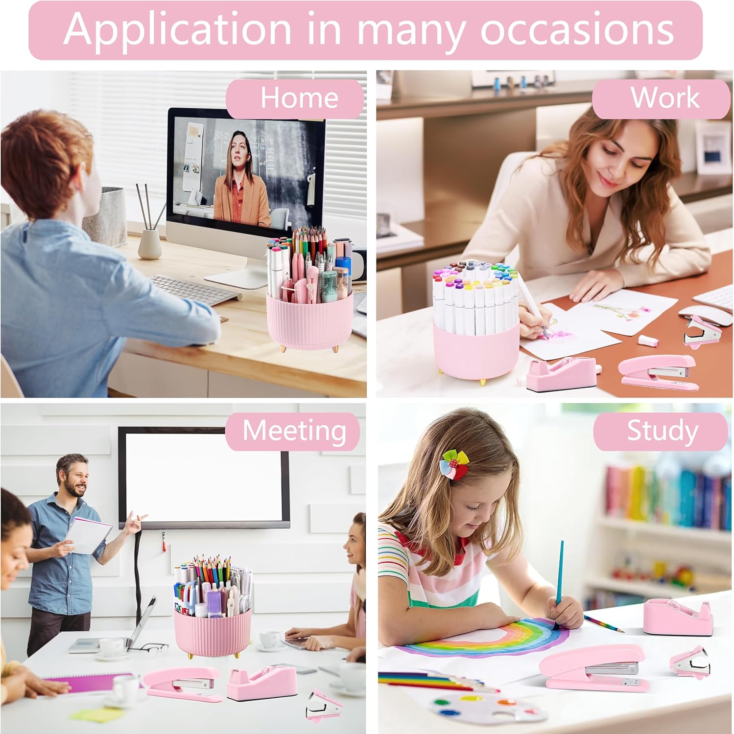 Pink Desk Accessories, Pink Office Supplies 360°Pen Holder Desk Organizers and Accessories with Tape Dispenser, Stapler, Staple Remover, 1000 Staples, Tape, Clips Set, Ruler, Scissor, Pen