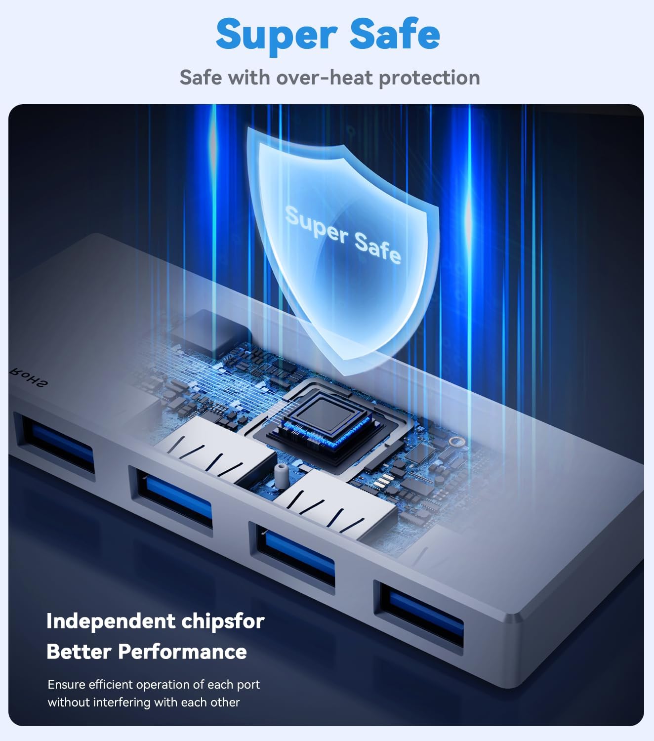 - High-Speed Data Hub: The 4-port USB distributor utilizes high-efficiency USB 3.0 to provide stable data transfers of up to 5Gbps (USB 3.0) and supports transfer speeds of 480Mbps (USB 2.0) and 12Mbps (USB 1.1).***This device is only used for data transmission and cannot be used to charge the device***