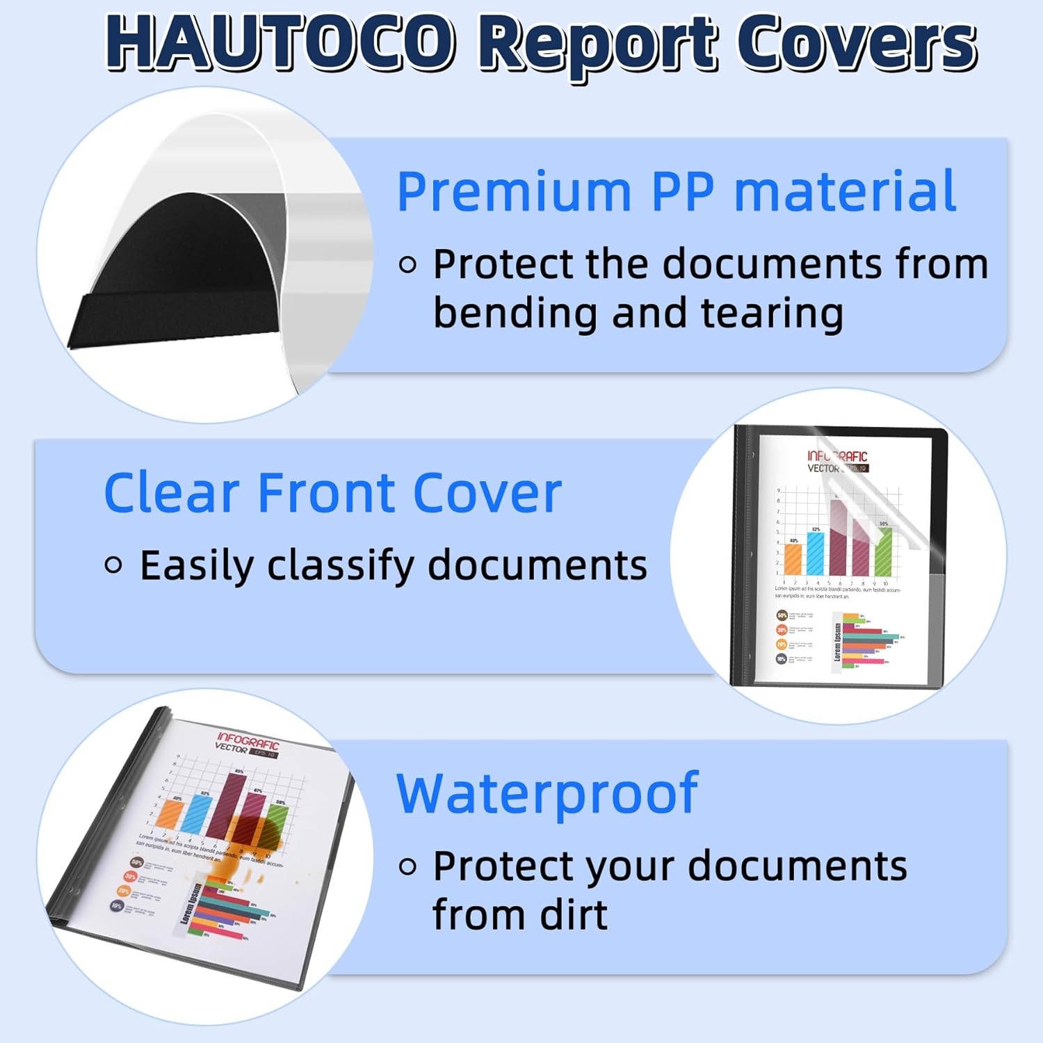 HAUTOCO 12 Pack Plastic Report Covers with 3-Prong Fasteners Clear Front Resume Portfolio Folder for 8.5x11 Letter Size Paper, Presentation Document Report Folders for Office School Use, Black
