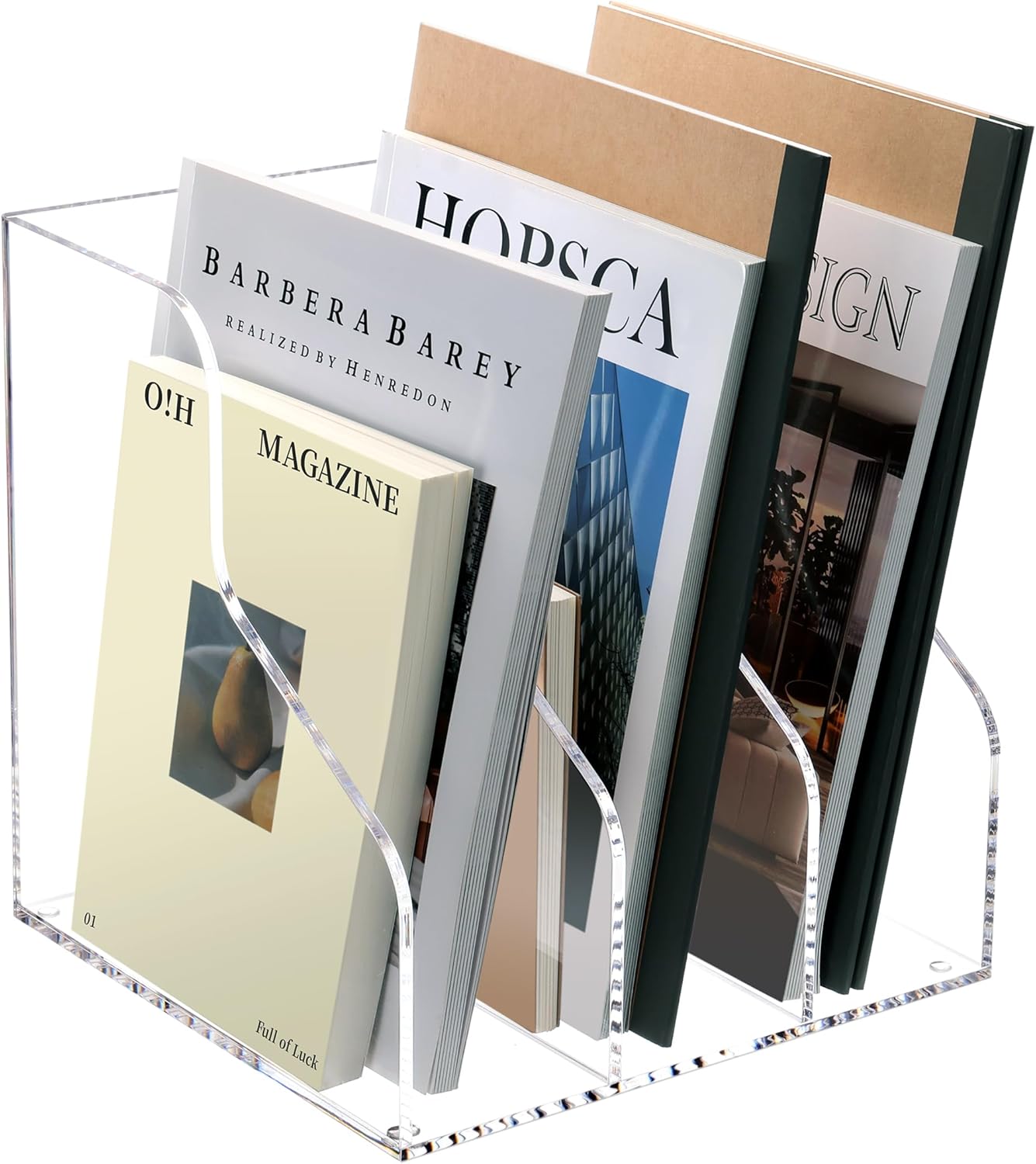 - [Transparent Design Desktop Organizer] Our Clear Magazine File Holder features 3 compartments, the width of the slots of the file folder holder stand is 2.95 inches. Clear Acrylic Desk File Sorter make it easy to categorise your storage space and identify the contents of each section at a glance.