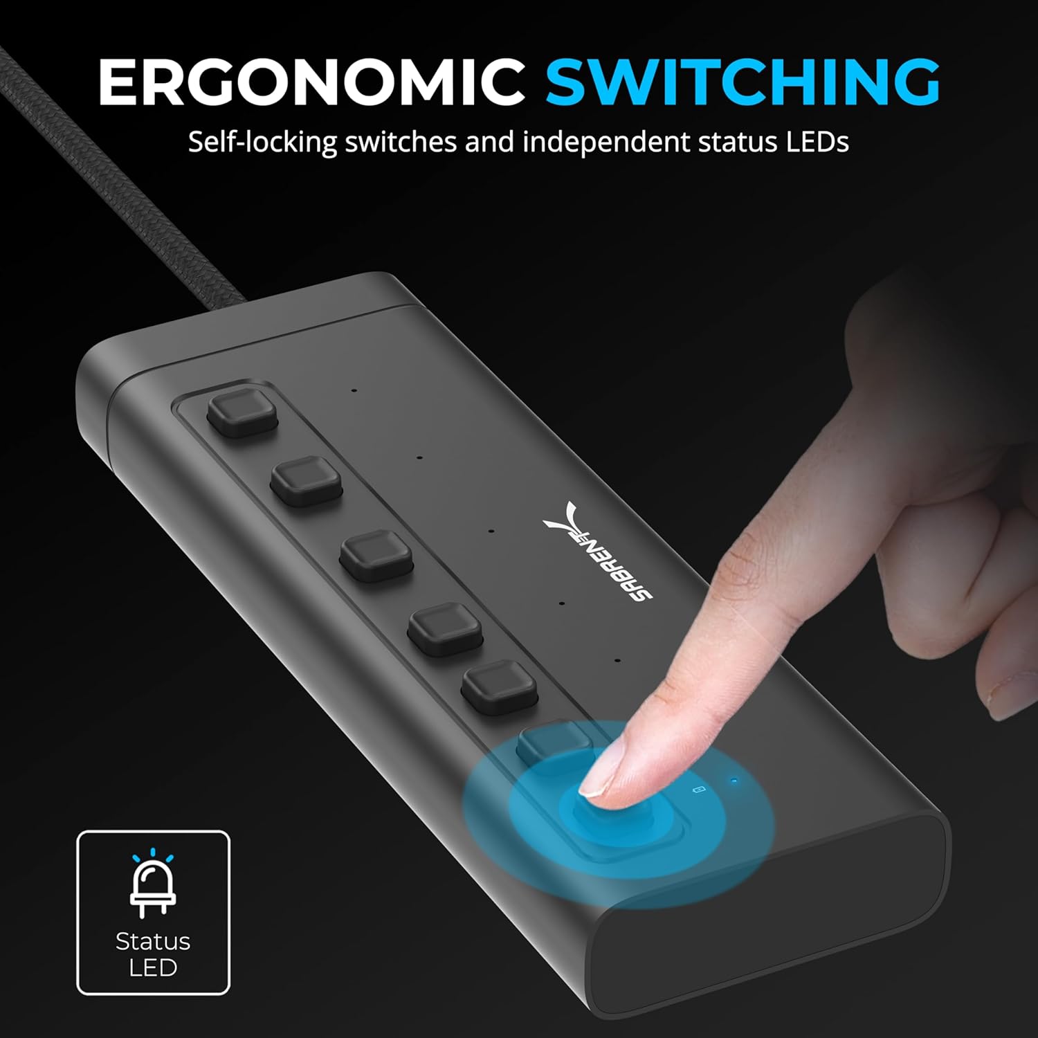 - Independent Power Switches: Each port includes a dedicated on/off switch with white LED indicators for full control over every connected device.