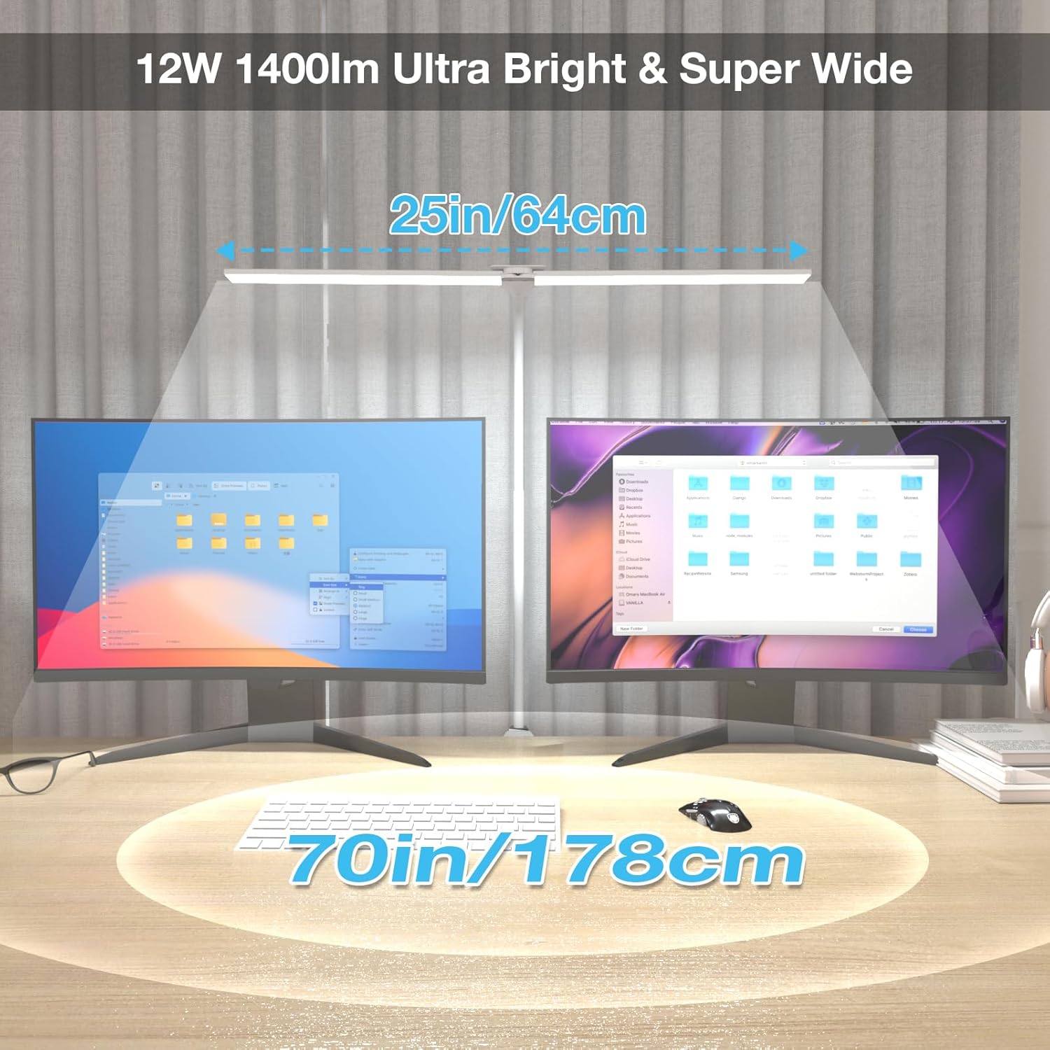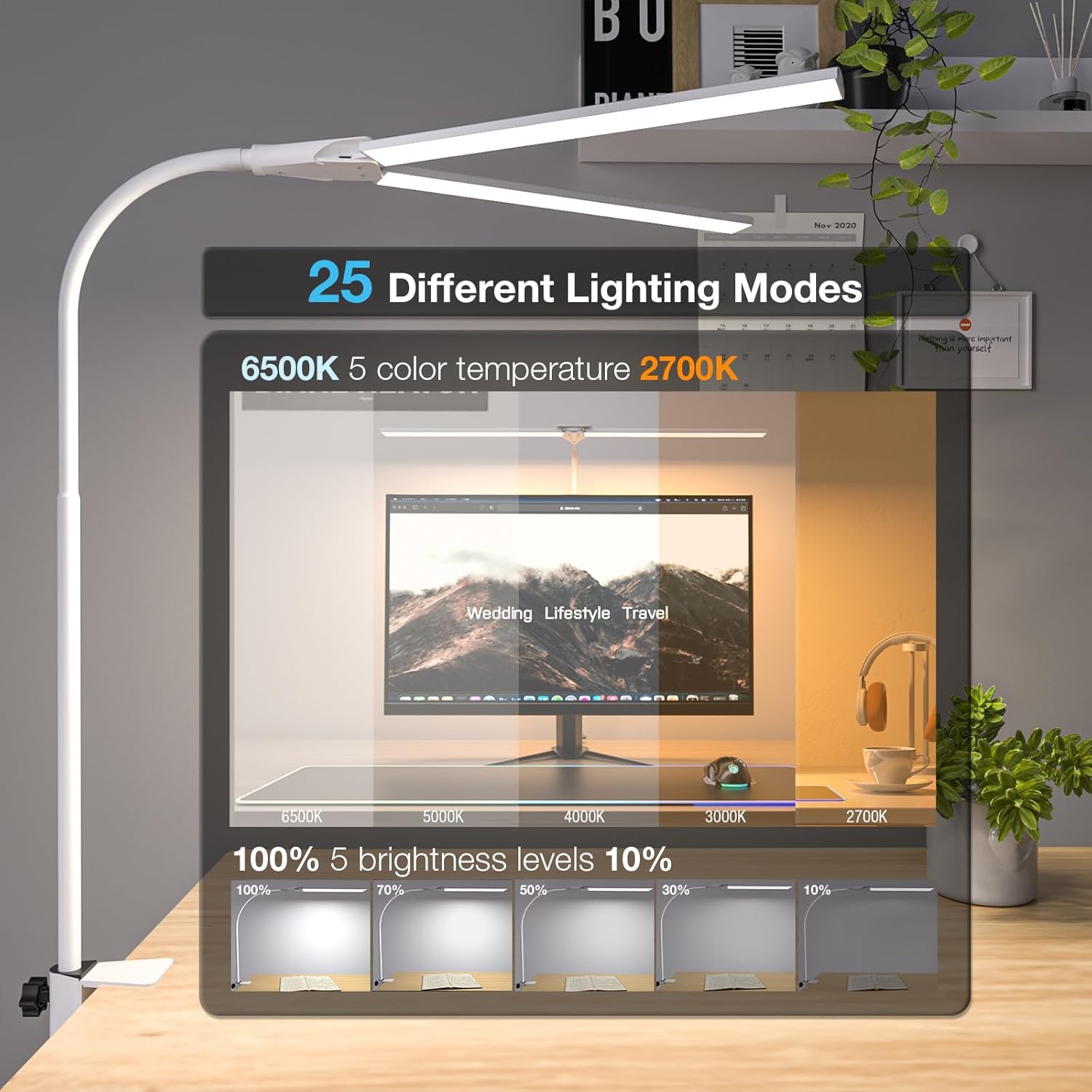 LED Desk Lamp, Double Head Desk Lamps for Home Office, Dimmable 25 Lighting Modes Bright Desk Lighting,12W 1400lm Eye-Caring Architect Table Lamp for Workbench Monitor Reading Study, White