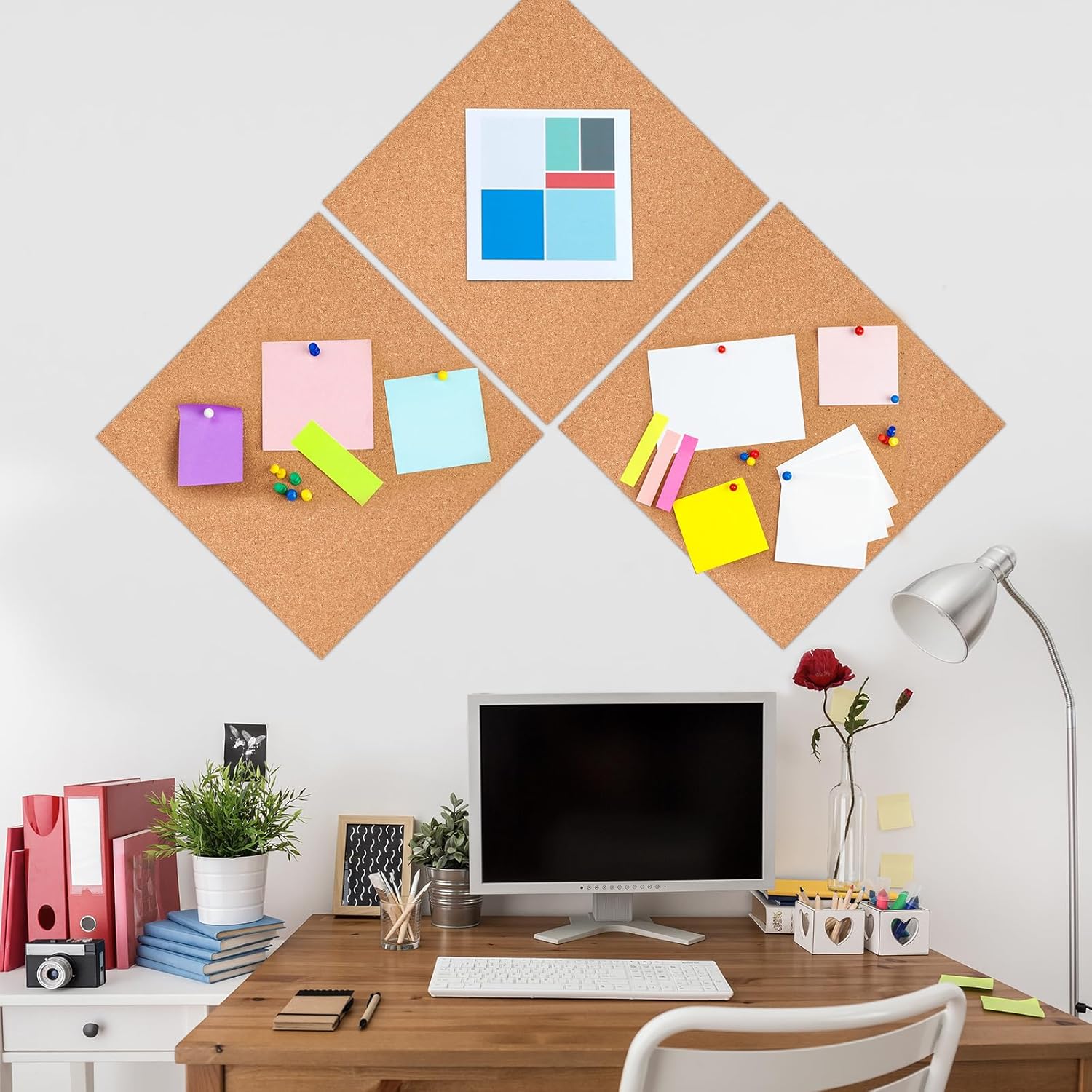 6 Pac Self-Adhesive Square Cork Boards for Wall with 100 Push Pins for Bulletin Boards Cork Wall Home School Office Decorative(12"x12"x1/4" )