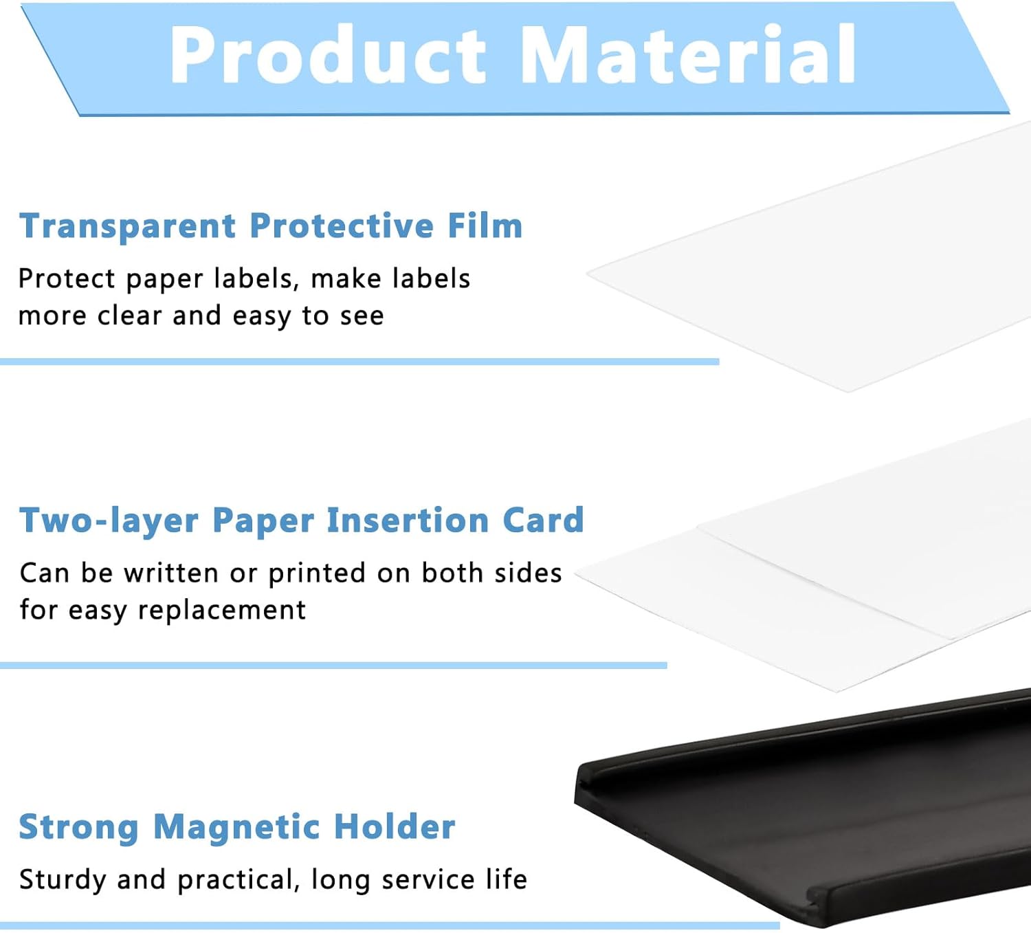 - EASY TO USE: The magnetic sign holder measures 4 x 1.6 inches, its "C" channel allows the card to slide in nicely, making it easy to quickly change the label information without worrying about the card falling off; the protective film is used to prevent fading of printed or written text on the card, ensuring that the information is clearly visible