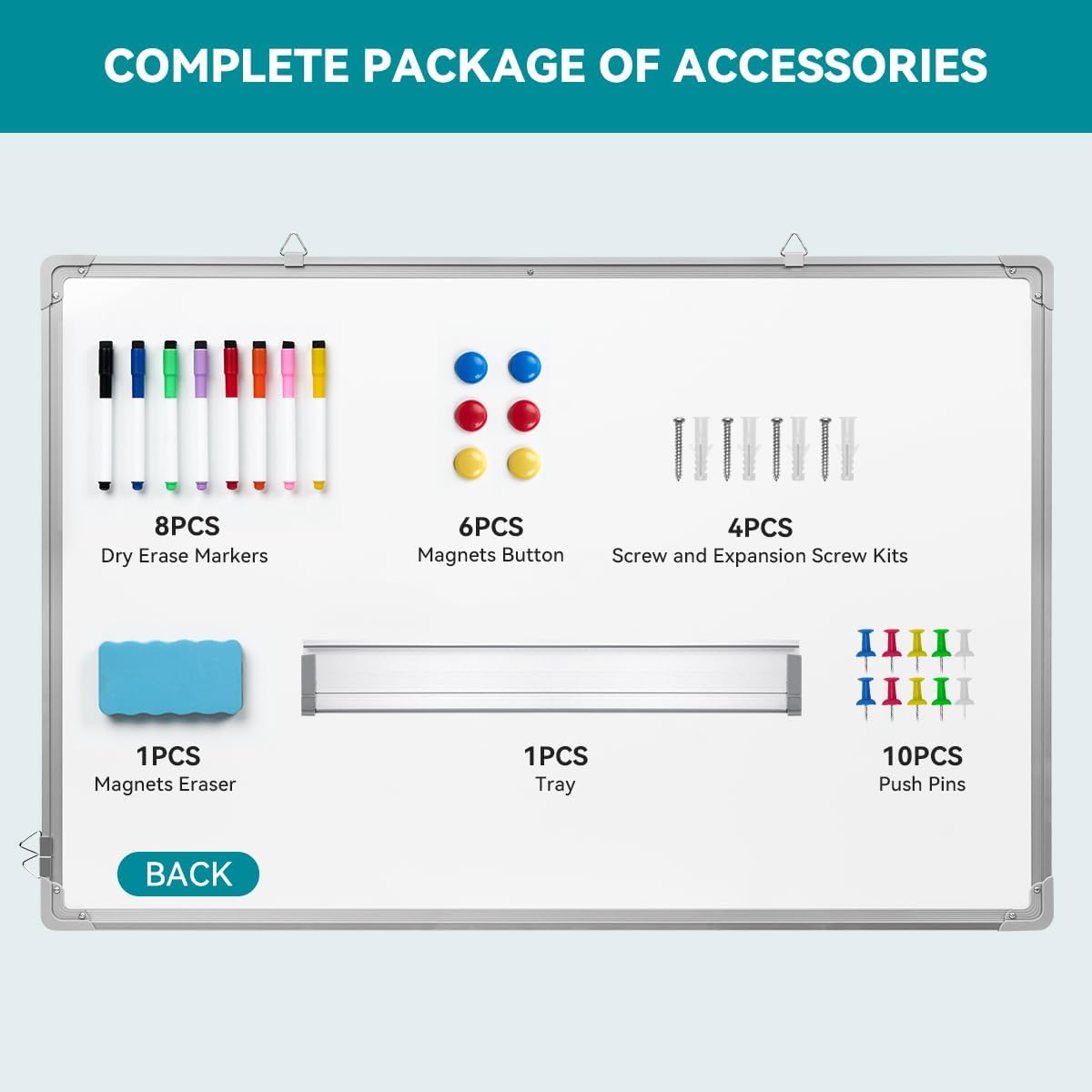 - 【Complete Accessory Set】-Get everything you need in one package! This white board calendar includes 8 vibrant dry erase markers, 1 easy-to-use eraser, 6 strong magnets, 1 convenient marker tray, 4 sets of expansion screws for secure mounting, and 10 push pins for the cork strip. This comprehensive accessory kit ensures you’re ready to start using your white board calendar dry erase right out of the box.