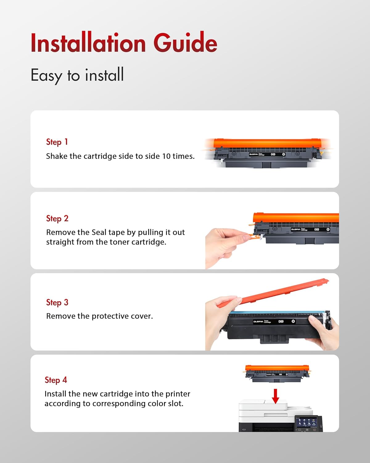 - 1. What's in the box: Total 4-Pack 069 toner replacement for Canon 069 toner cartridge set. Package Includes 1 X 069 Black Toner Cartridge, 1 X 069 Cyan Toner Cartridge, 1 X 069 Magenta Toner Cartridge, 1 X 069 Yellow Toner Cartridge and 1 X User Guide