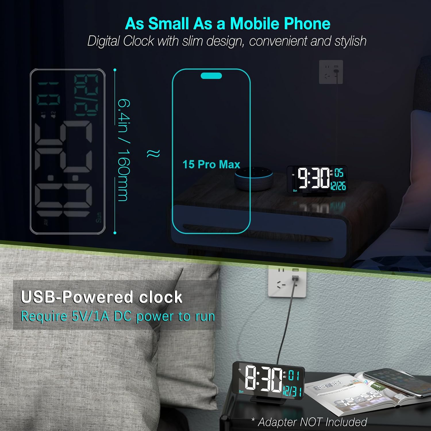 - [6.7in Black Digital Clock] The black alarm clock features 6.7-inch LED light display with a sleek mirror clock style, which has dual alarms,12/24-hour format, date, day of week, seconds, temperature (℉ / ℃), and auto/manual dimming, it is also a stylish and modern digital calendar for room accessories. Additionally, the bright big white and sky blue digits make the desk clock cool and easy-to-read.