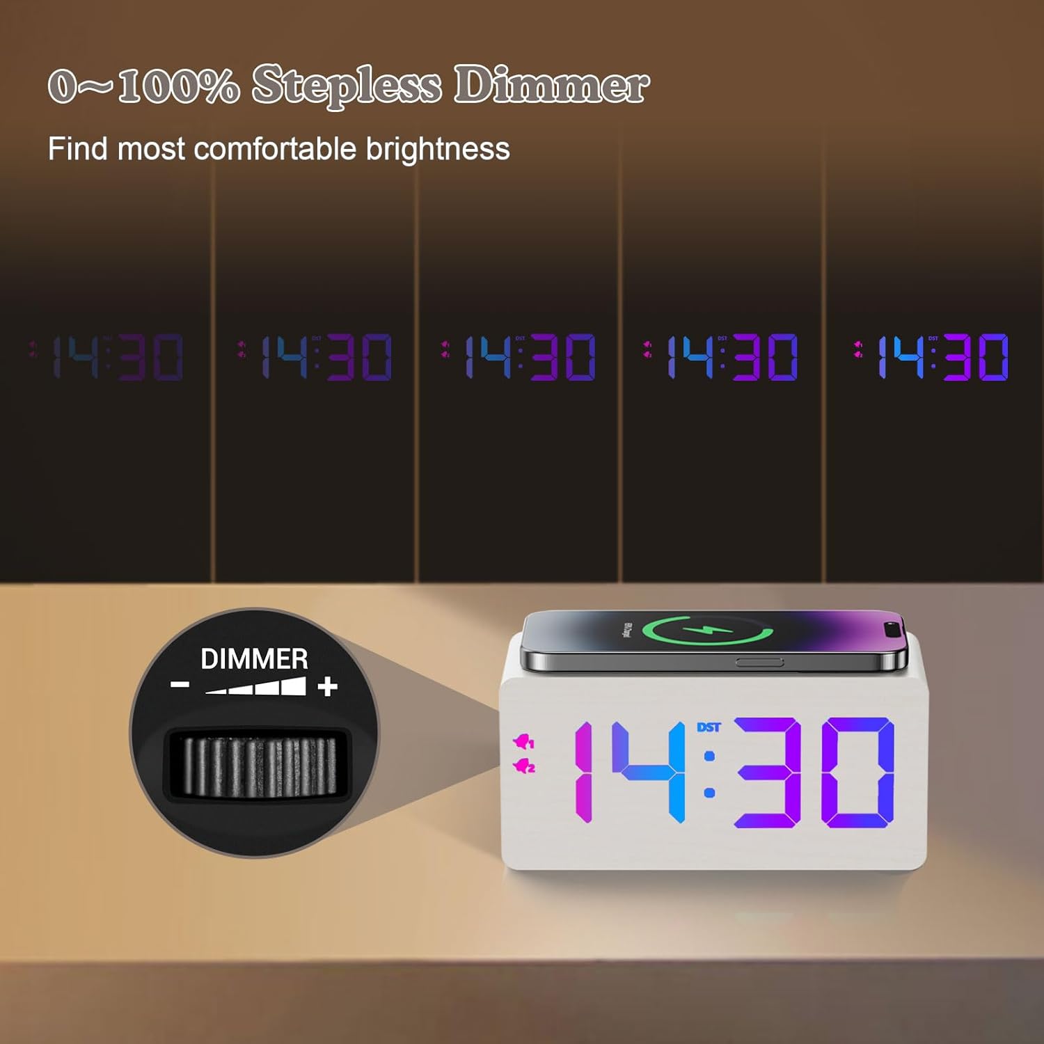 - Special Feature : Large Time Display with Bold Numbers, 0~100% Stepless Dimmer, 10W Fast Wireless Charging, 8 RGB Colors Display, Stylish Wood Grain Surface, Dual USB Charging Ports, Dual Alarm Clock, Snooze Button, Manual DST, etc. Large Time Display with Bold Numbers, 0~100% Stepless Dimmer, 10W Fast Wireless Charging, 8 RGB Colors Display, Stylish Wood Grain Surface, Dual USB Charging Ports, Dual… See more