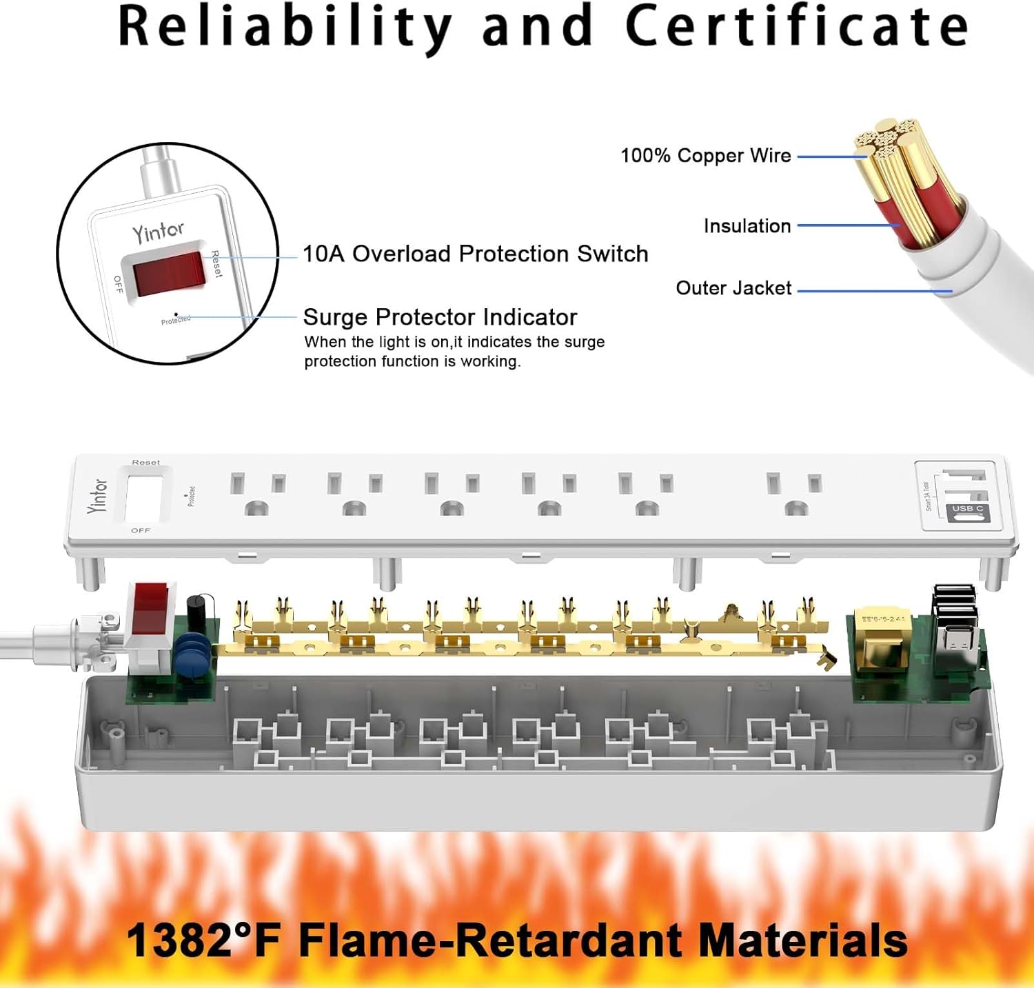20Ft Power Strip Surge Protector - Yintar Extension Cord with 6 AC Outlets and 3 USB Ports for Home, Office, Dorm Essentials, 1680 Joules, ETL Listed, White