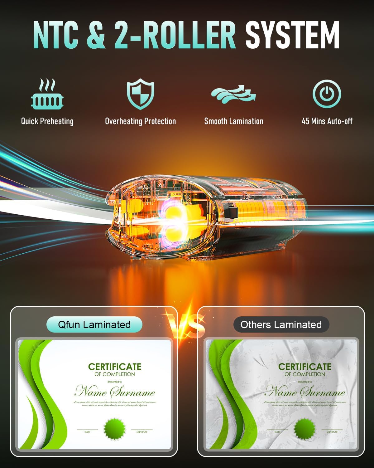 - 60 Seconds Warm-Up For Efficiency: The Qfun laminator machine is ready to start laminating in 60 seconds. Laminating speeds of up to 450mm/minute are up to 70% faster than other models in the industry. This allows your projects to move forward at a rapid pace and dramatically improves work efficiency. No bubbles, no wrinkles, easy to operate, ideal personal laminator for teachers, business person, suitable for saving important documents and precious photos