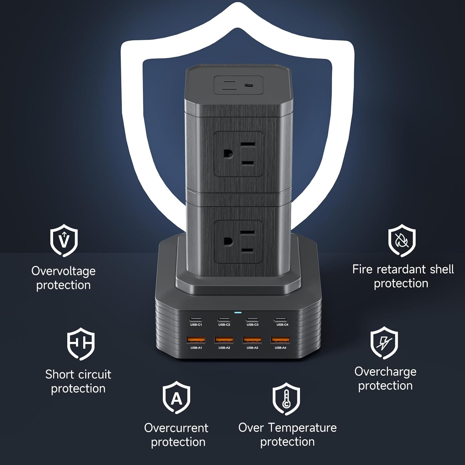 - 【17-in-1 Charging Station】9 AC outlets+4 USB-C Ports+4 USB-A Ports Charging Station Supply power for laptops, smart phones and tablet PCs. Total control switch fingertip can control the power supply, safe, effective, convenient and comfortable. Meet the requirements of high-power wire, the resistance is smaller, the load is reduced, and the conduction is safer, has a unique appearance design. Universal output voltage from 5V to 20V,automatic switching,just plug & go
