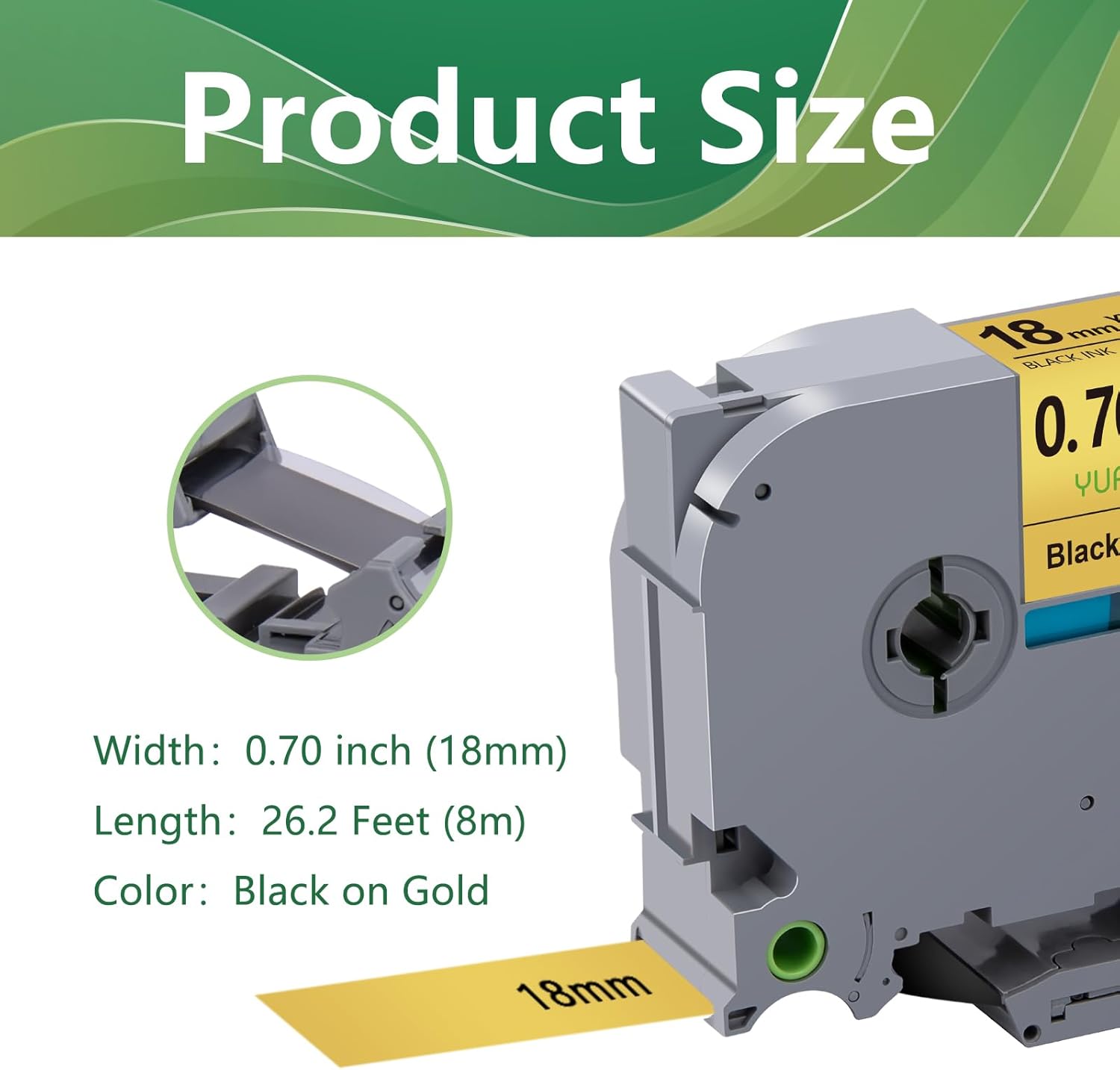 - Product Size: Width: 18mm 0.7 inch, Length: 26.2 feet (8m) for each 18mm 0.7 inch laminated gold label tape