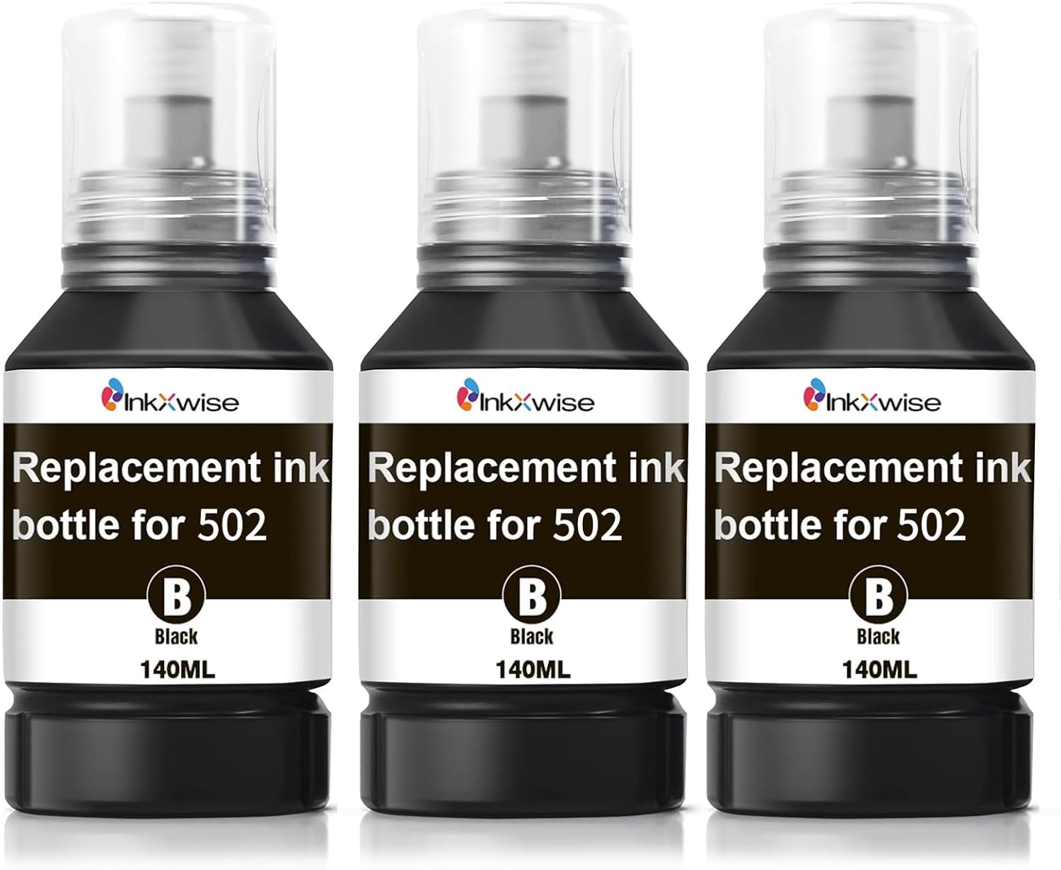 Compatible Replacement for 502 Pigment Black Ink Refill Bottles Replacement for Epson 502 Ink for Ecotank ET 2850 ET 3850 ET-4760 ET-2760 ET-3830 ET 15000 ET-3843 Printers (Black, 3-Pack)