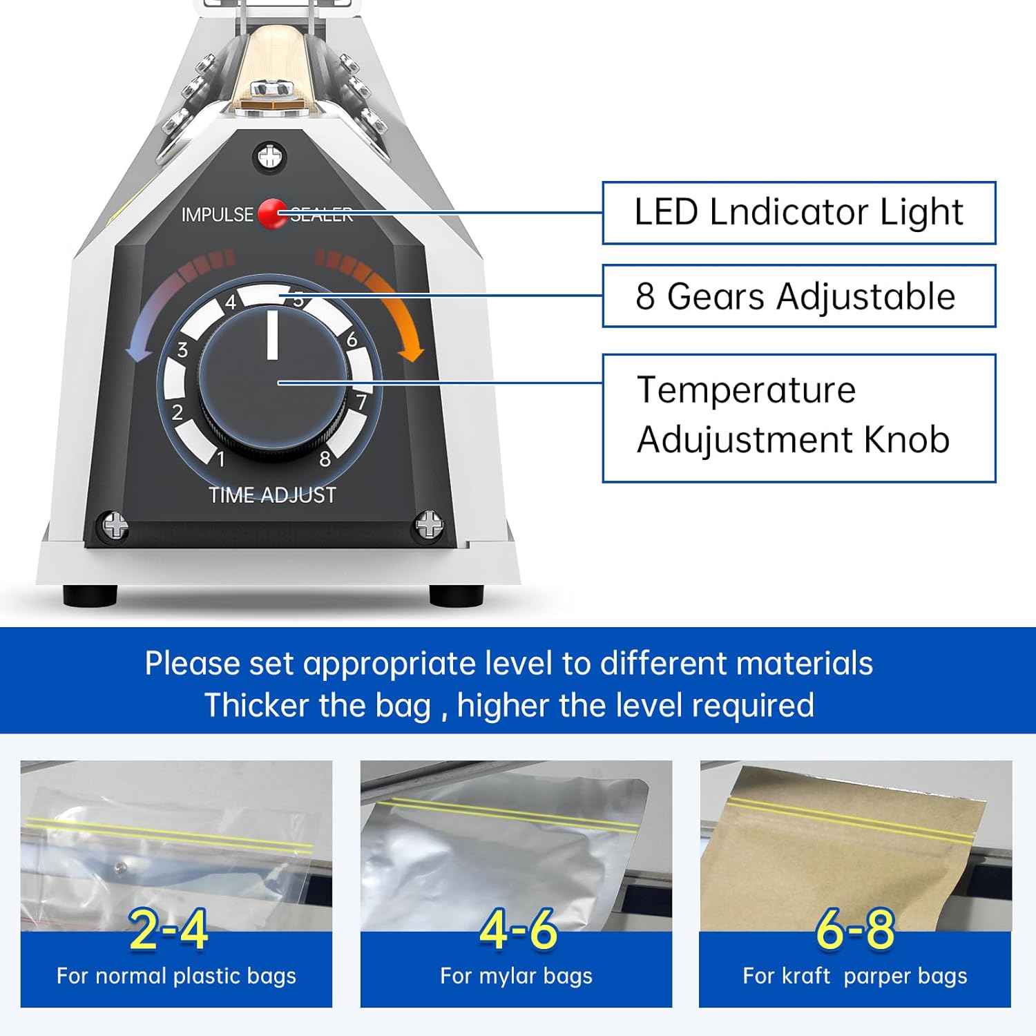 - [Instantly use and optimal results]: With no warm-up time needed, our R-PACK Impulse Heat Sealer is ready to use right away. Simply keep the handle pressed down for 3-5 seconds to achieve perfect seals every time. The lightweight design and 8 stalls temperature adjustment feature allow for easy operation and compatibility with different materials bags.