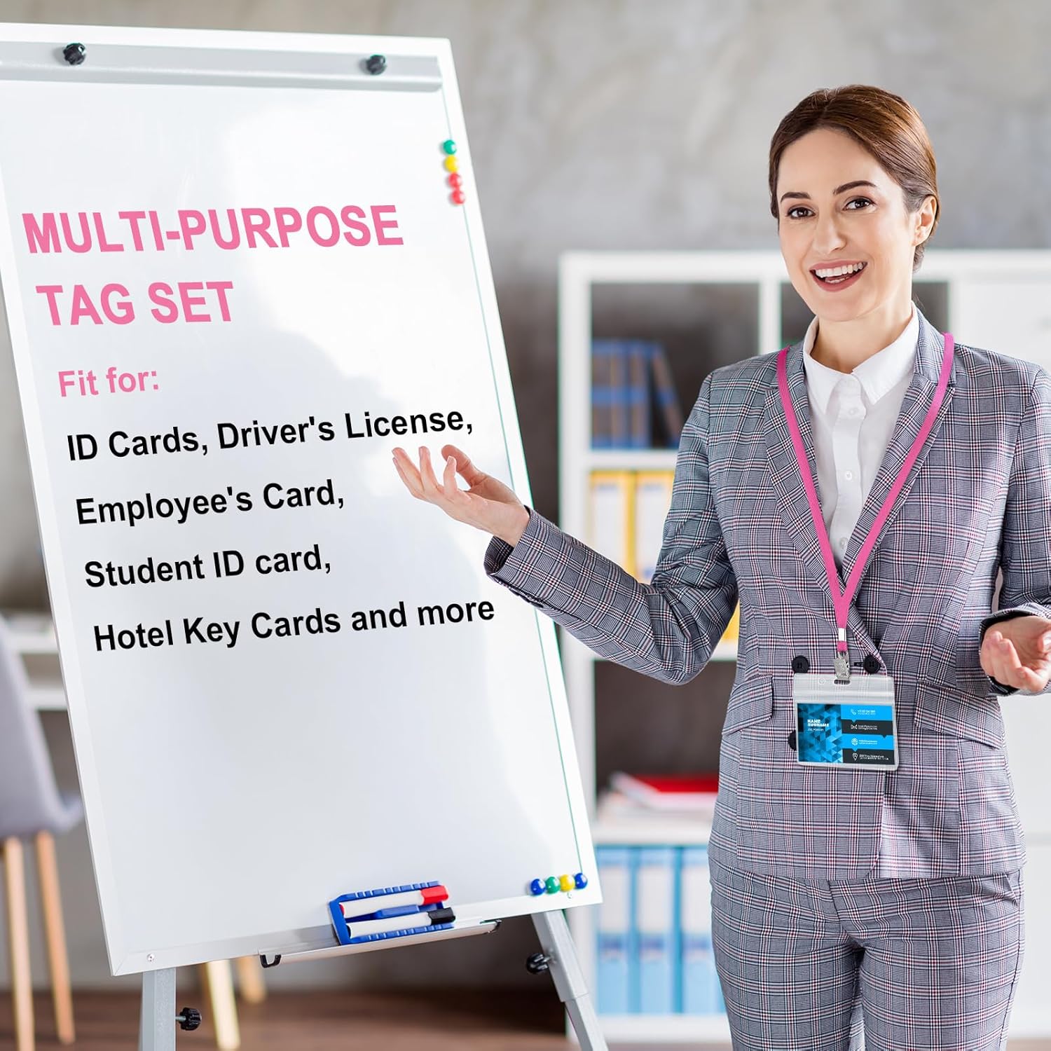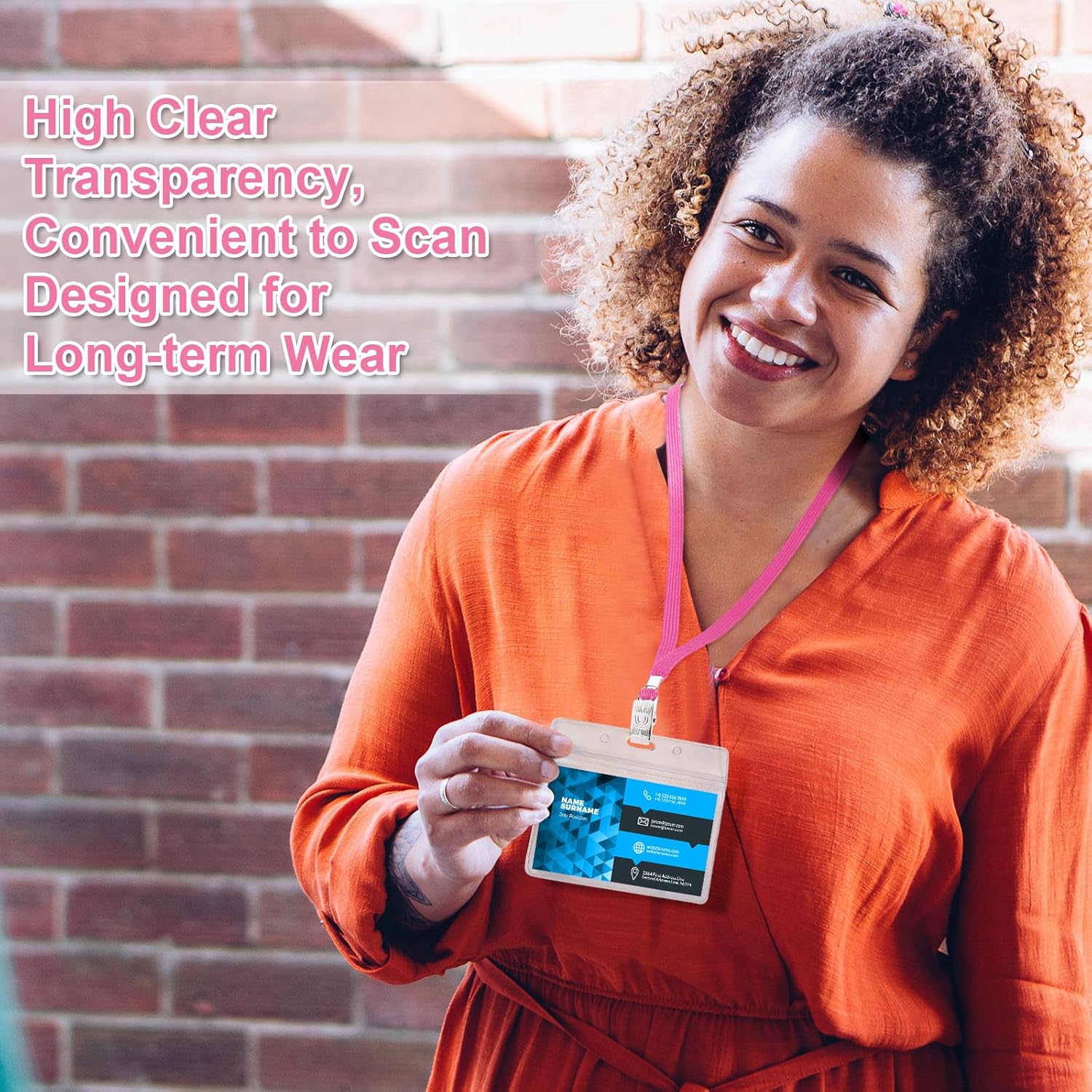 Marspark 100 Sets Clear Name Tags with Lanyard, Lanyards for ID Badges Reusable Strap with ID Holder Plastic Name Badges for Adults Business School Church Conference (Pink)