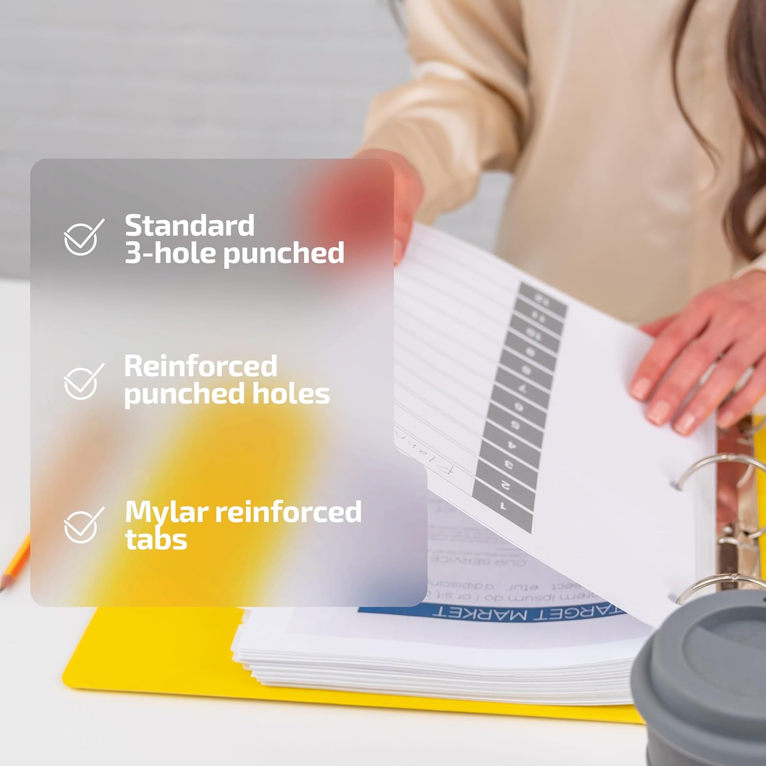 - REINFORCED PUNCHED HOLES: Each hole punch is reinforced to prevent tearing or damage. The tabs are ideal for home, office, and school use.