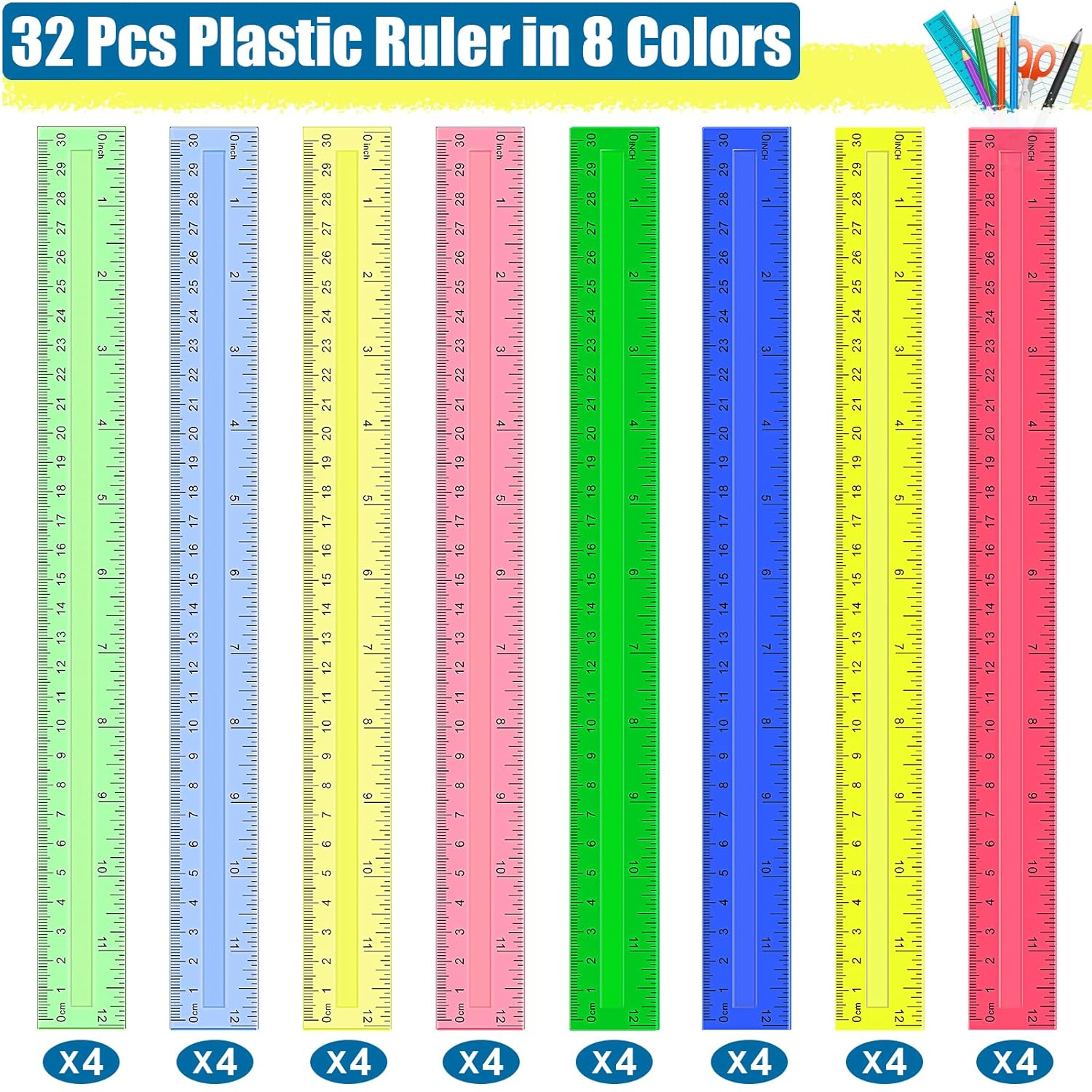 12 Inch Plastic Rulers, 32 PCS Transparent Assorted Color Metric Bulk Rulers with Inches Centimeters Millimeter. Measuring Drawing Tool for Kids, Ideal Back to School Office Home Supplies