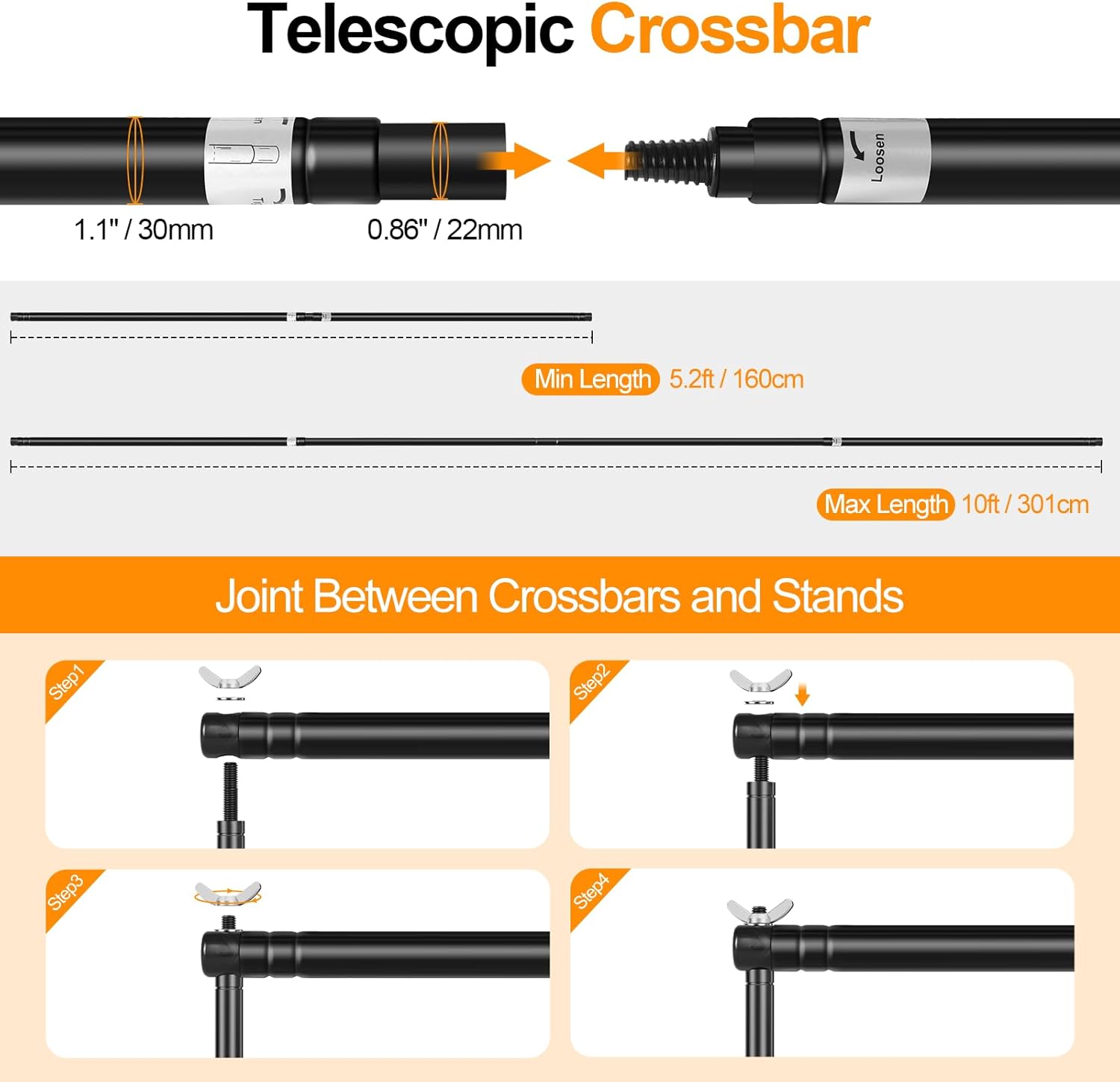 - Adjustable Backdrop Stand: With adjustable height (3.4ft-8.5ft / 40.8in-102in) and width adjustable (5.2ft-10ft / 62.4in-120in). The telescopic design allows you to flexibly adjust to the required size