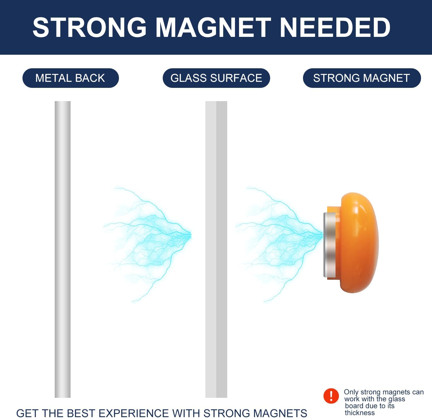 - MAGNETIC GLASS WHITEBOARD - Our glass white board comes with a multifunctional steel-backed magnetic glass and 4 high-power glass board magnets. Making this glass whiteboard perfect for meetings and presentations. (NOTE: The magnetism will not be strong due to the thickness of the glass, standard magnets do not work. The eraser is not magnetic.)