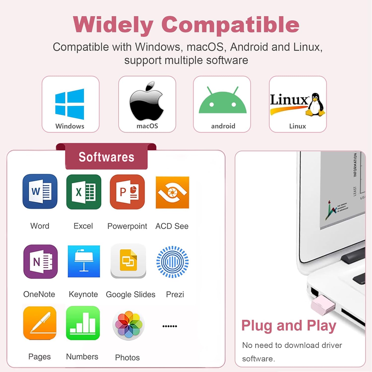 - Wide Compatibility - This pointer for presentations is compatible with Windows, macOS, Linux, Android and leading presentation software like PowerPoint, Keynote, Prezi, Google slides and more