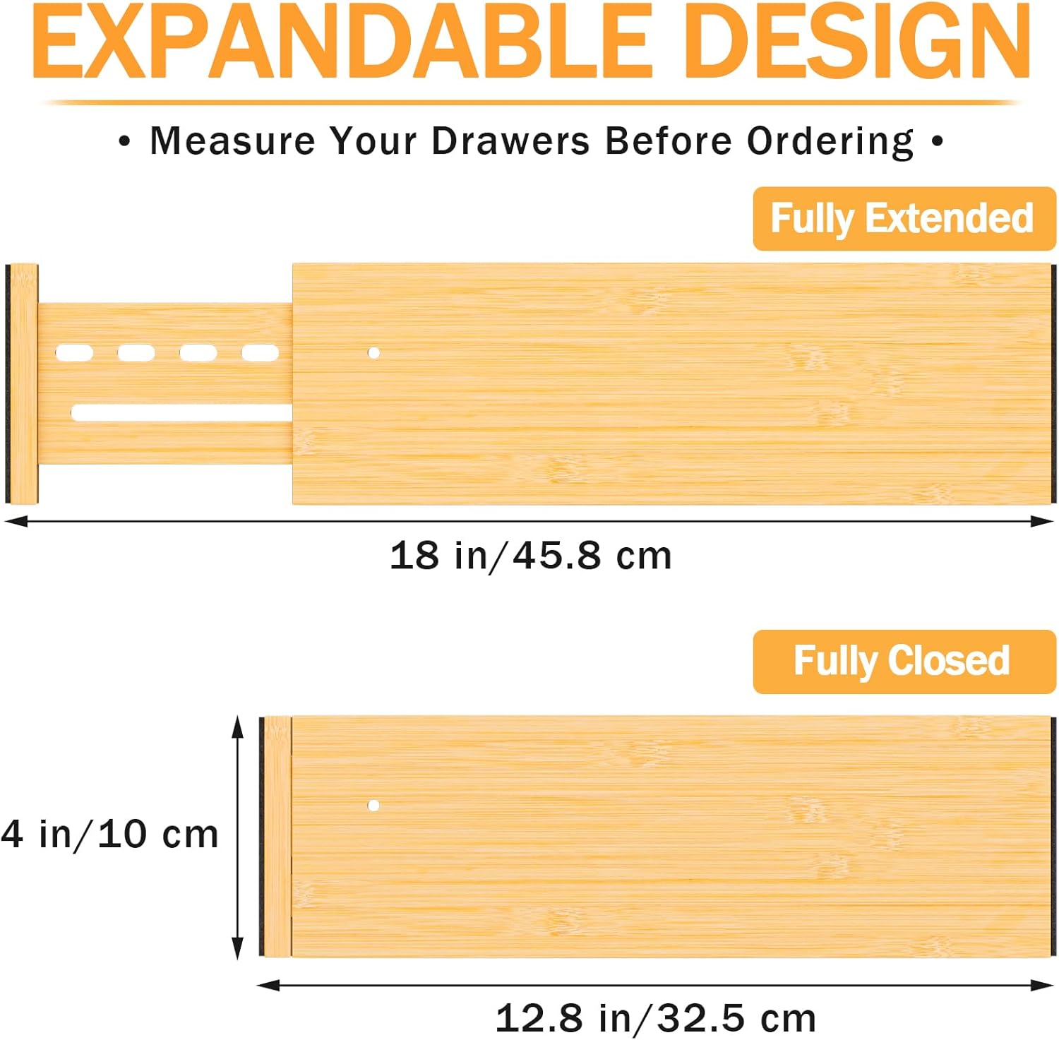 Bamboo Drawer Dividers 4" High, 12.8-18" Adjustable Drawer Organizers for Clothes,Expandable Dresser Separators in Bedroom/Kitchen/Bathroom/Office Organization and Storage,2 Pack