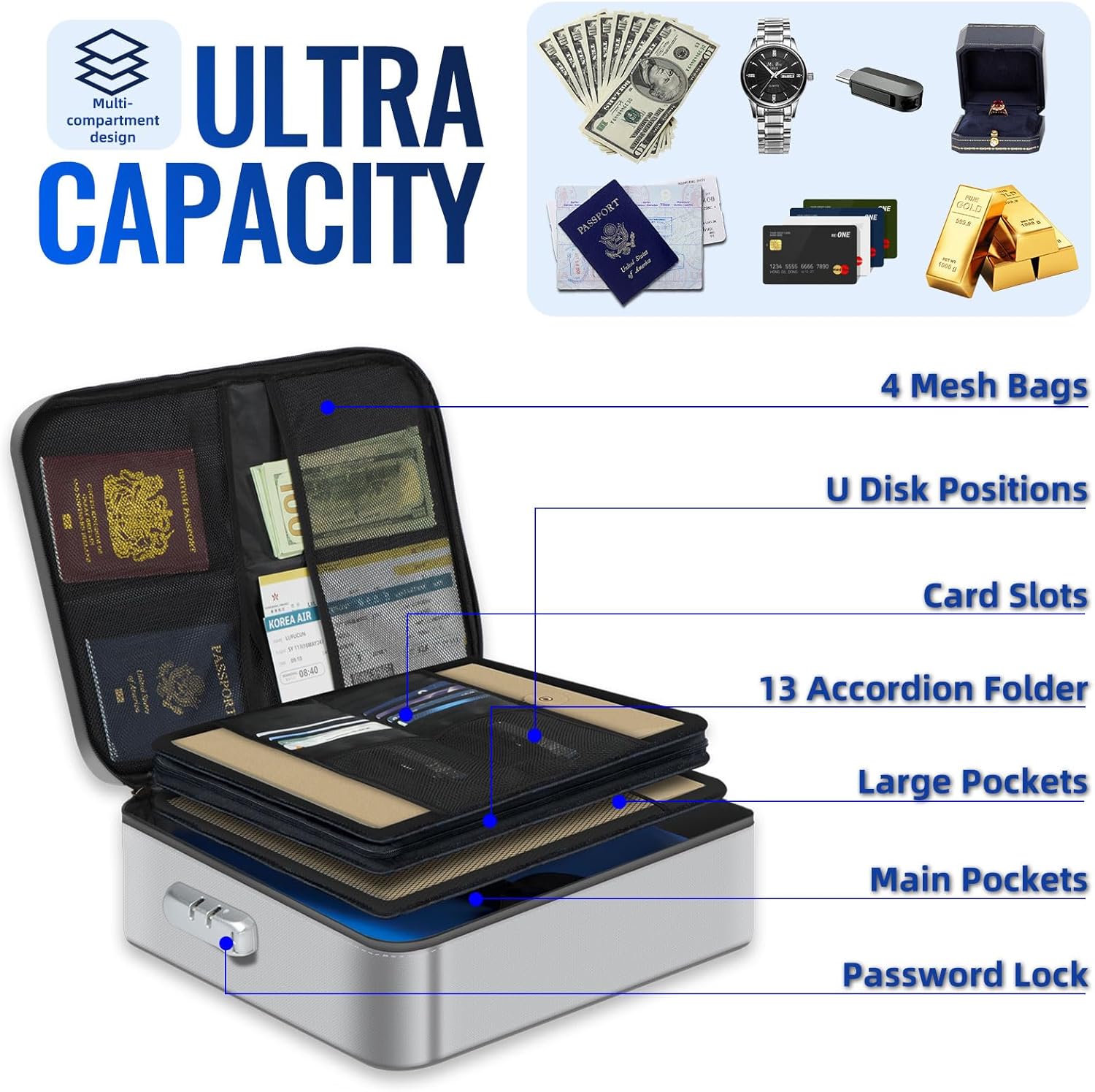 - Upgraded Ultra Capacity: Our fire safe bag has multi-layer of design, with the Jumbo Dimension: 15.7 x 11.8 x 3.9 inch, includes 8x passport mesh bag, 16x card slots, 5x folder layers, removable 13-layer accordion file organizer, and a large space for document storage. It's perfect to store birth certificate, tax filing, diplomas and certificates. And keeping your document well and organized.