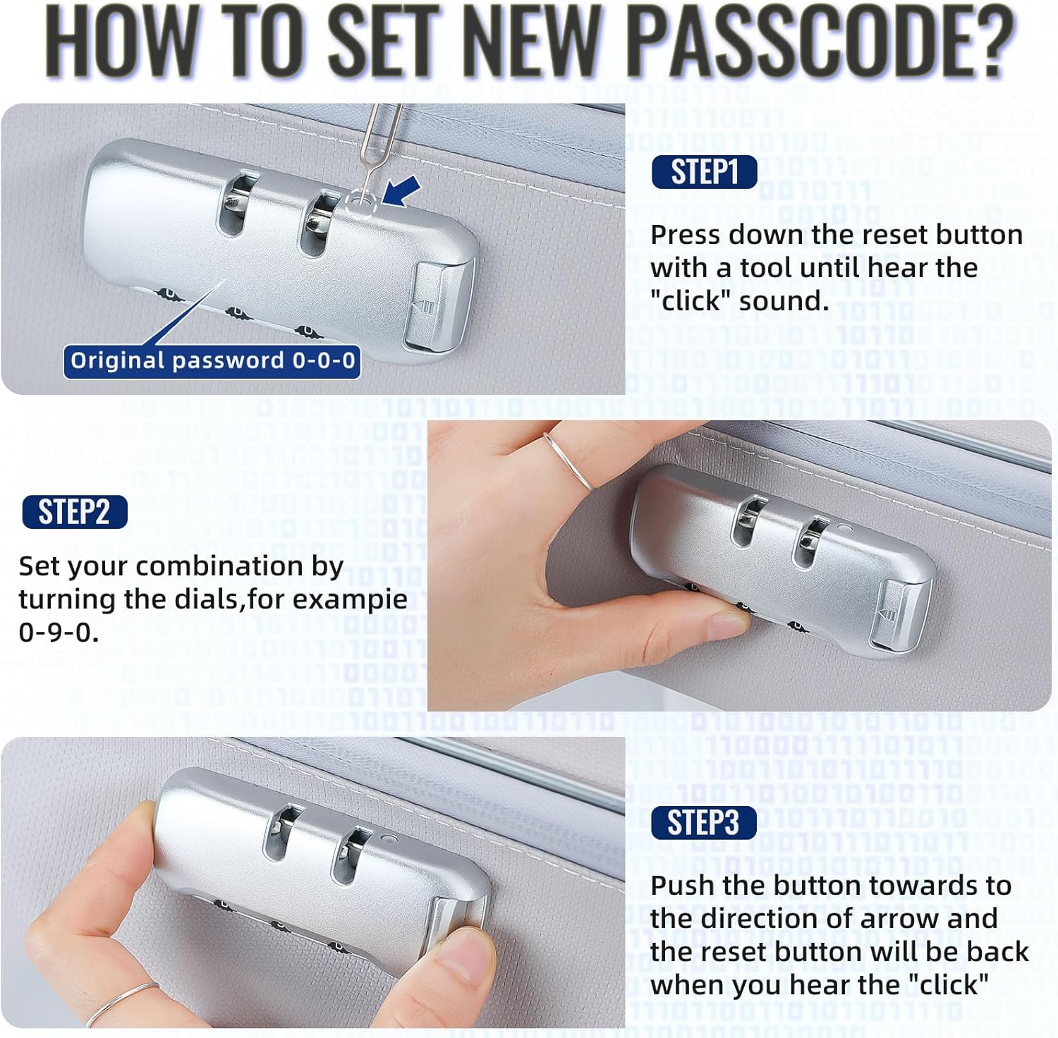- With Combination Lock - More Security: Our fireproof document safe is equipped with 3-Digit Combination Lock to provide additional safety for your valuables & privacy. It's easy to set your own password (picture attached): 1) Keep the lock in open status (original password is "0-0-0"); 2) Press down the reset "Button" by a tool until "CLICK" sound; 3) Rotate the wheel button to change password; 4) Push the button towards to the direction of arrow and the password reset when you hear the "click".