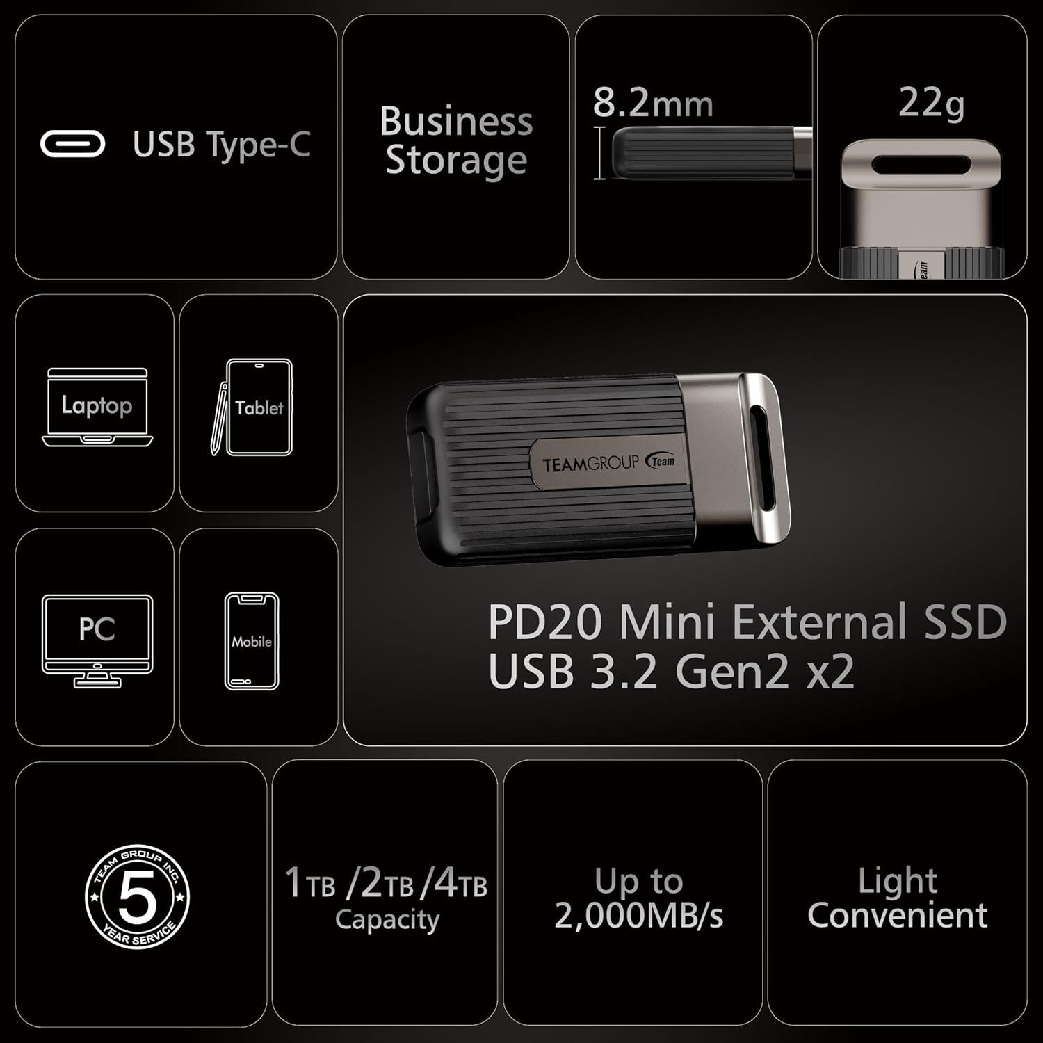 TEAMGROUP PD20 2TB Portable External Solid State Drive SSD Read up to 2000MB/s USB 3.2 Gen2x2 Type-C Waterproof Dustproof IP54 TPSEG5002T0C102