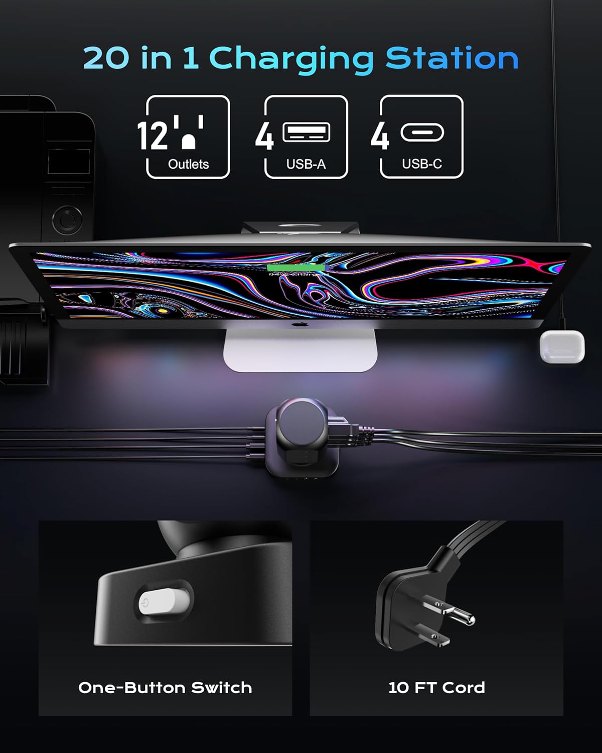 - 【20 IN 1 Power Strip Tower with USB】- This vertical power strip with USB ports features 12 AC outlets and 8 smart-charging USB ports(4 USB-C). It can charge 20 devices simultaneously without blocking, keep your desktop organized, widely use in home/office/dorm room. (Note: Please do not exceed the rated power 1875W ).