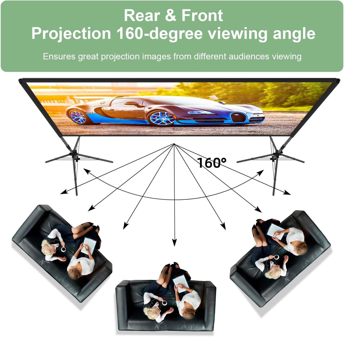 - 【Wrinkle-Free Movie Screen】100 inch projector screen with stand,4K Ultra Full HD projection screen 16:9 format,160° Wide Viewing Angle,Unlike ordinary screens, it is made of thicker polyester milk silk material, ensuring enhanced durability. That offers sharp and high-resolution images,even support front and rear projection screen