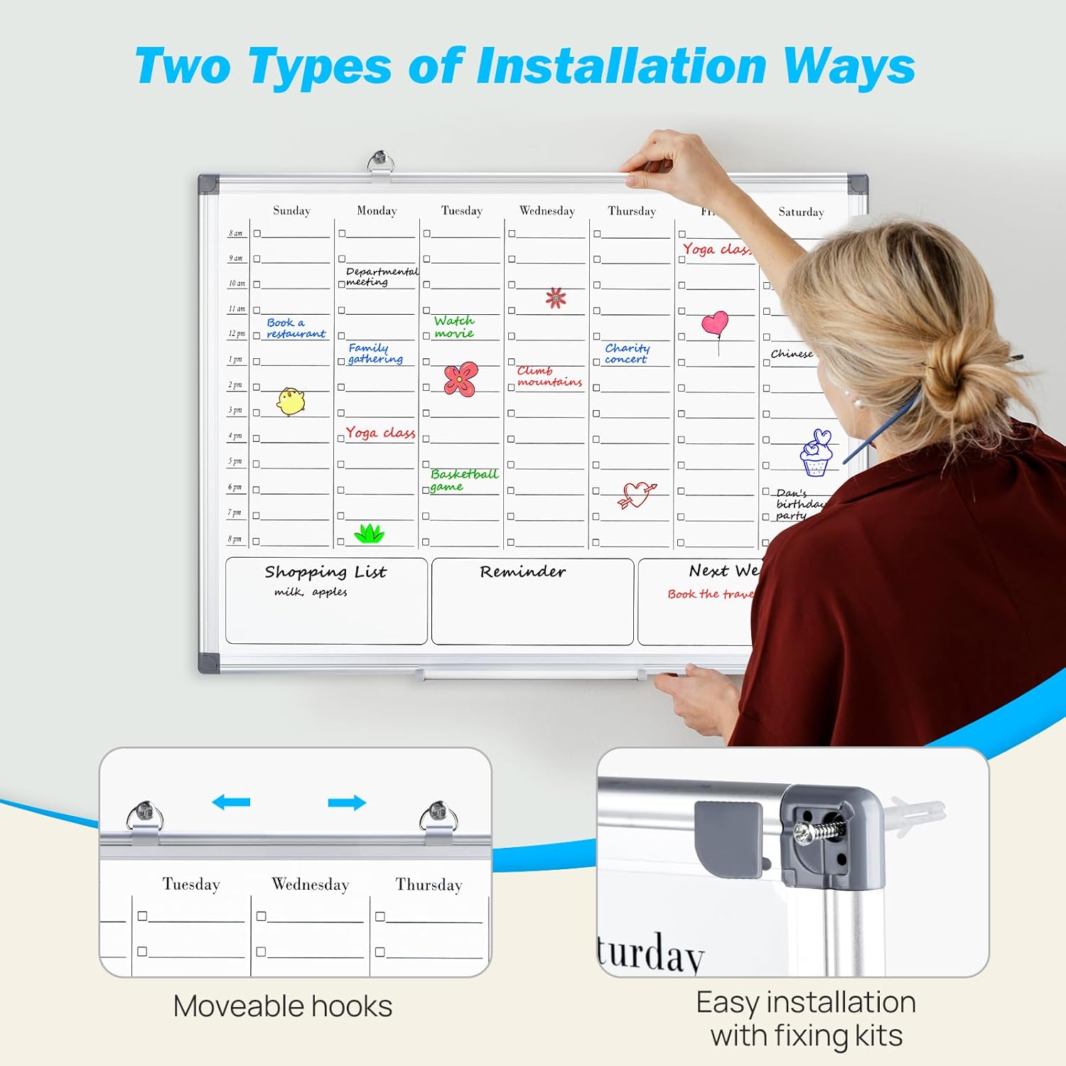 - 【Weekly Planner & Plain Whiteboard】This magnetic whiteboard for wall provides Double Side: Plain Blank White Board and Weekly Calendar Whiteboard. The front side is printed with a weekly schedule board, which is perfect for busy people to keep in track of important events and dates, or use as planner and to do list. The other side is blank, It is the best tool for home/school teaching or draw.
