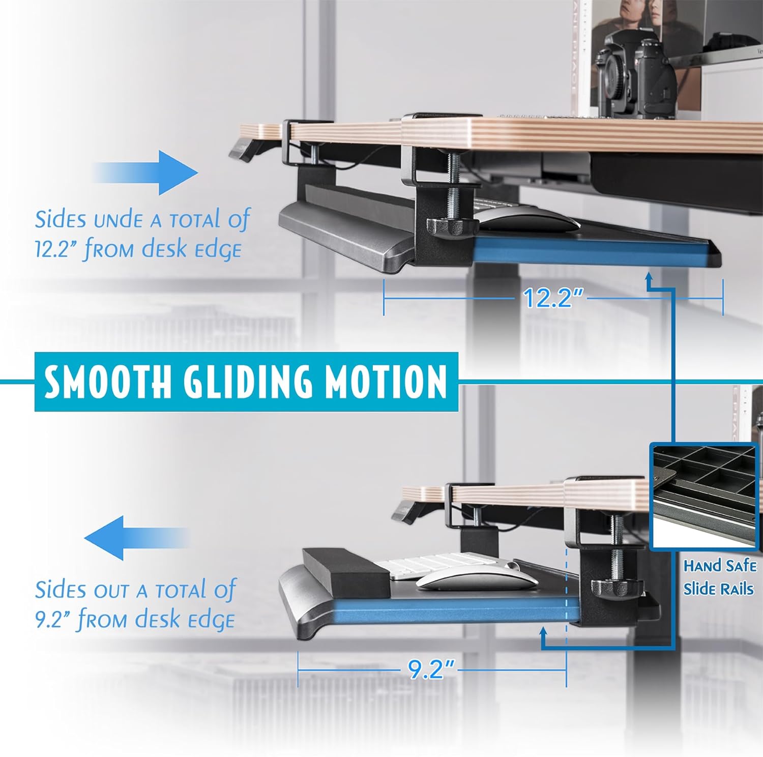 - Smooth Slide-out Tray: Effortlessly pull out the keyboard/mouse tray with the easy-glide sliding mechanism, allowing for seamless access and smooth operation to a maximum of 12.2/5.2 inches from the edge/under-table space.