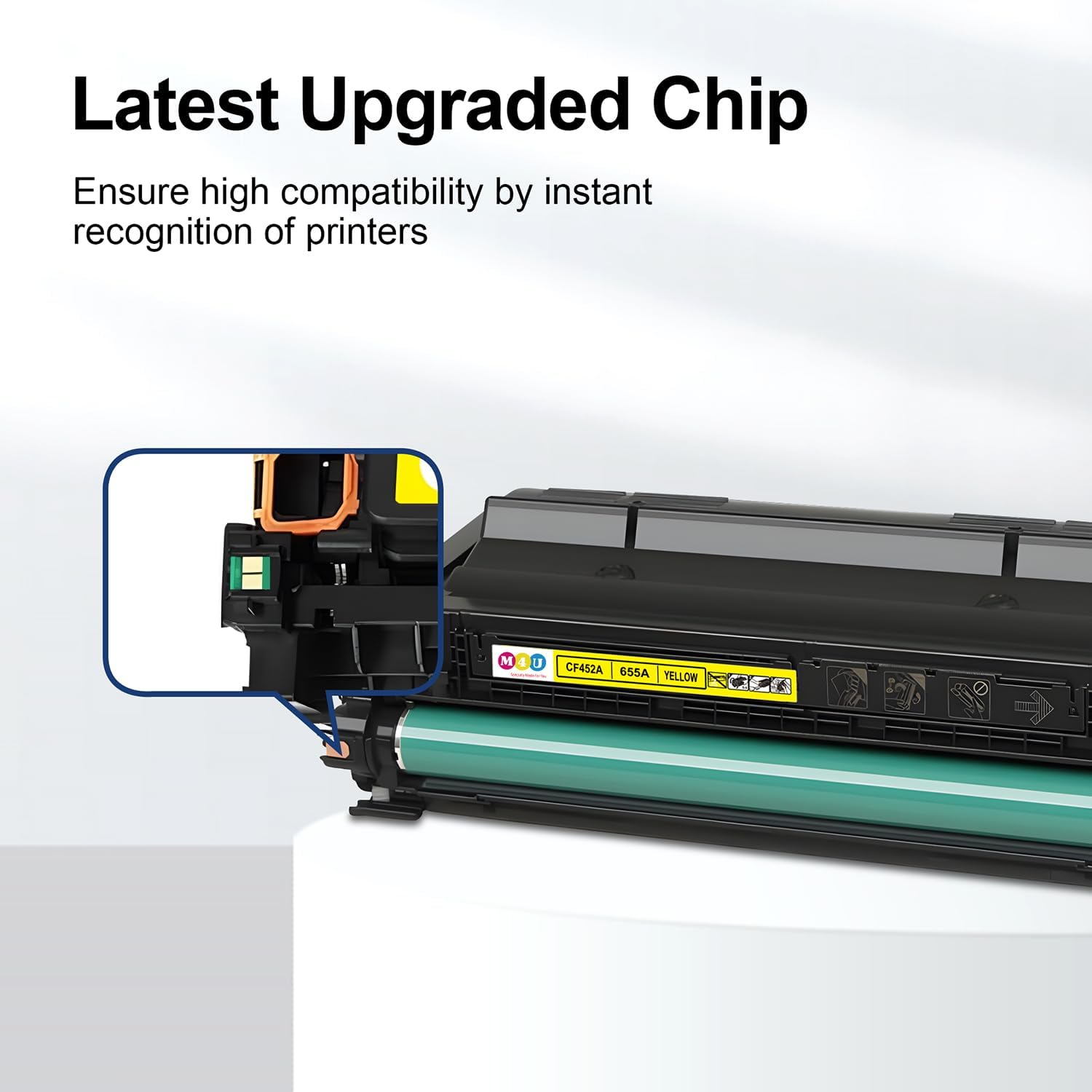 - High Page Yield: 12,500 Pages Compatible for 655A black toner and 10,500 Pages per Color toner at 5% coverage (Letter/A4). The inbuilt chip can indicate the toner level left and you can arrange a new replacement when needed