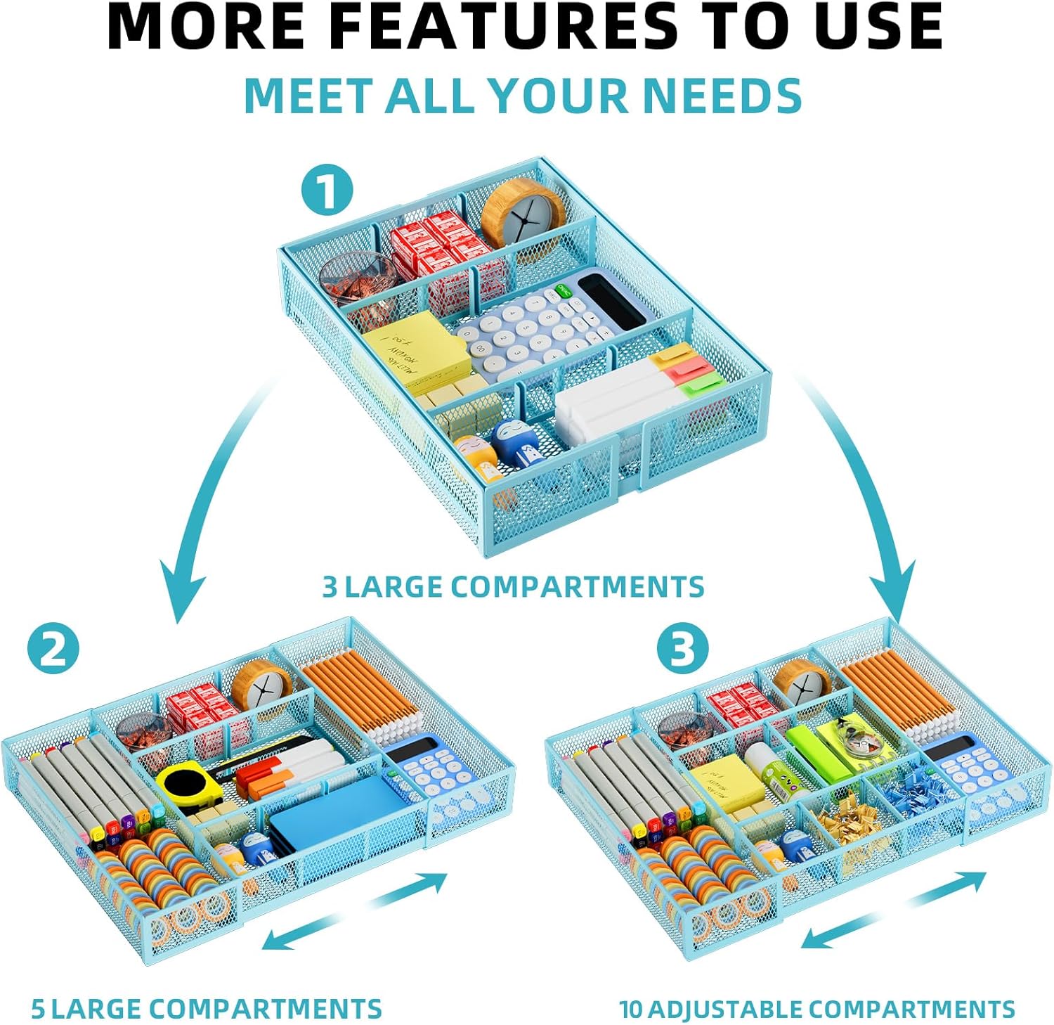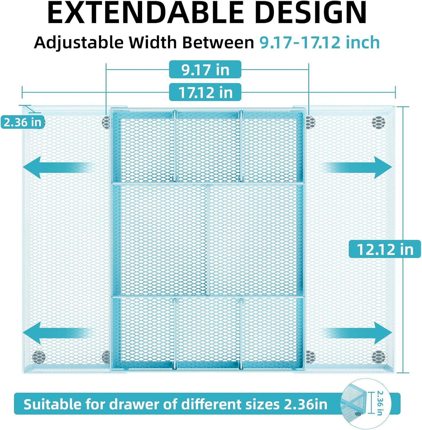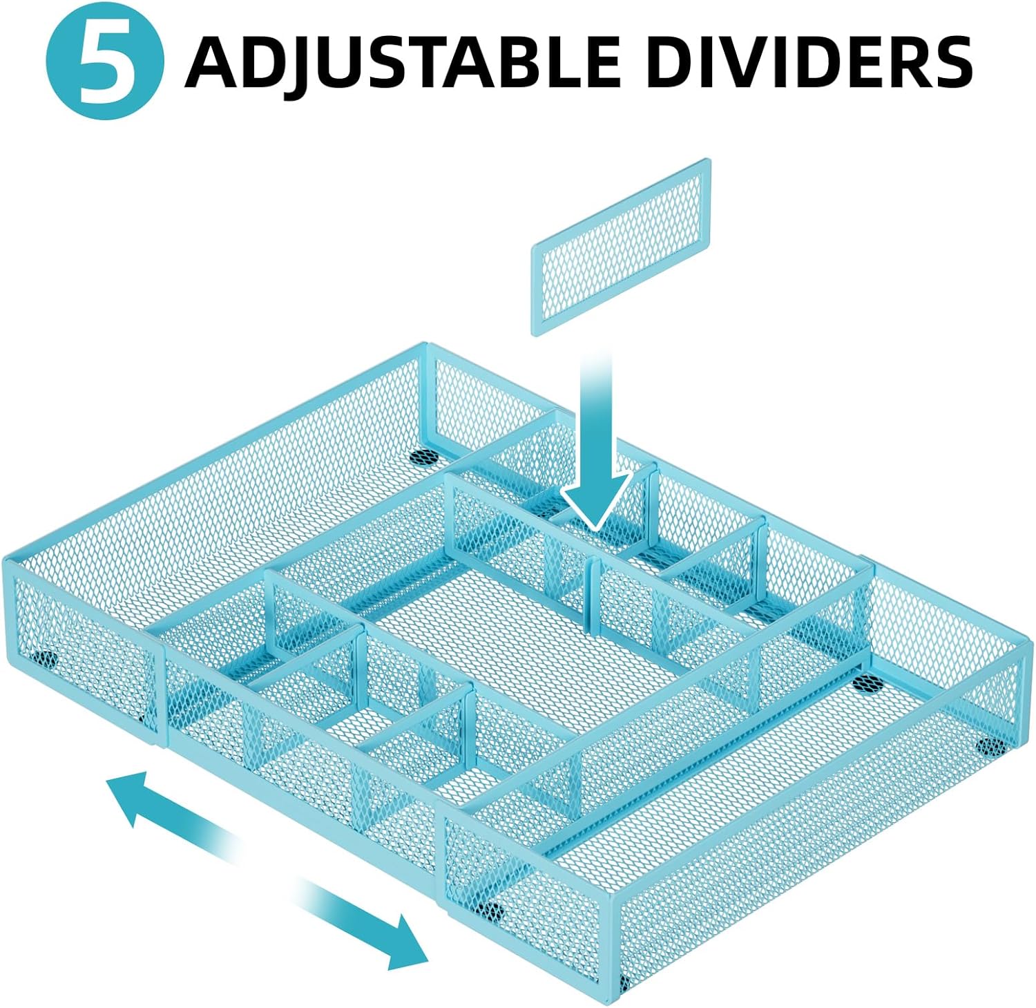 Marbrasse Expandable Desk Drawer Organizer, Mesh Drawer Organizer Tray with 10 Adjustable Compartments, Desk Organizers and Accessories for Office Supplies, Makeup & Vanity (Expandable-Blue)