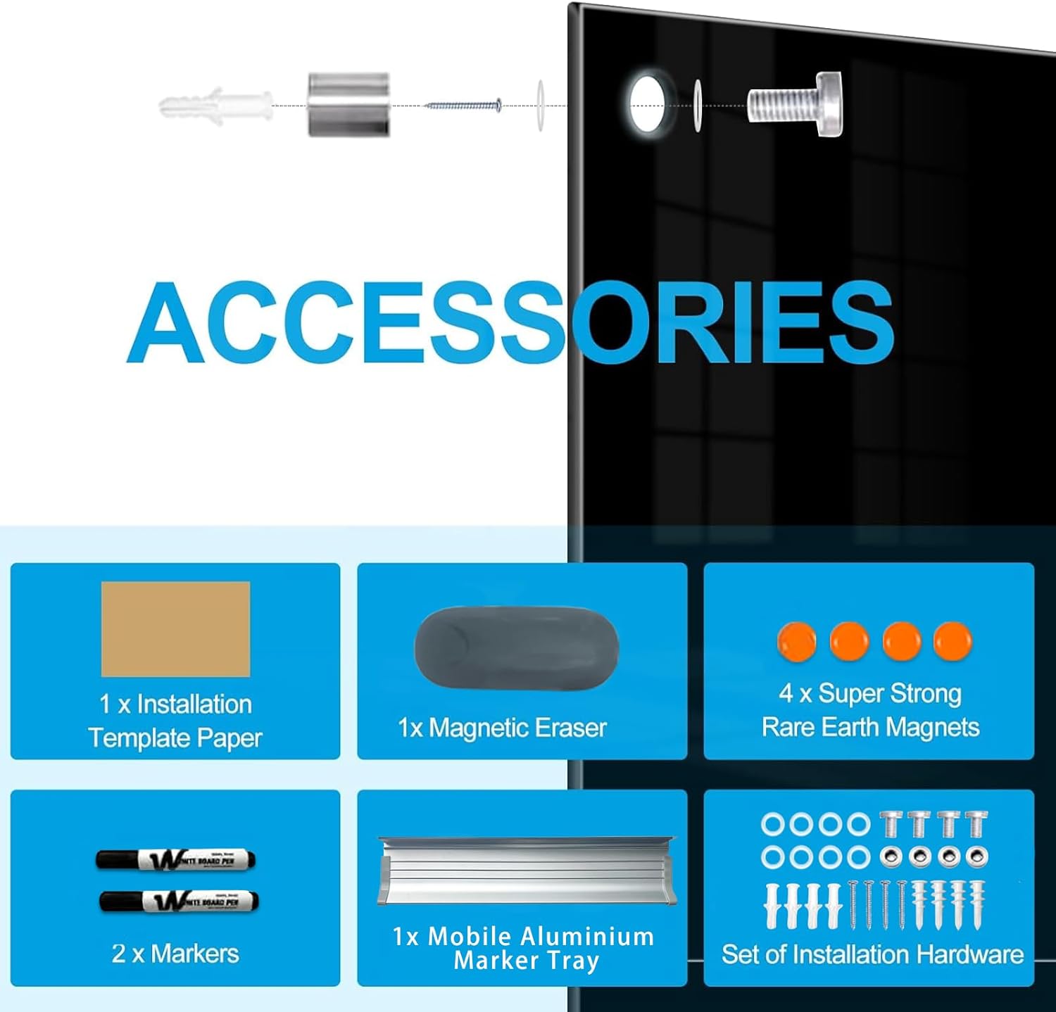 - COMPREHENSIVE ACCESSORIES SET: Comes with one 48" x 36" frameless tempered glass whiteboard, two markers, four magnets, one eraser and one marker tray for mounting. Pay special attention to the magnetism will not be strong due to the thickness of the glass, standard magnets do not work. Please use silvery super strong rare earth magnets. Don't use normal black magnet and fridge magnet